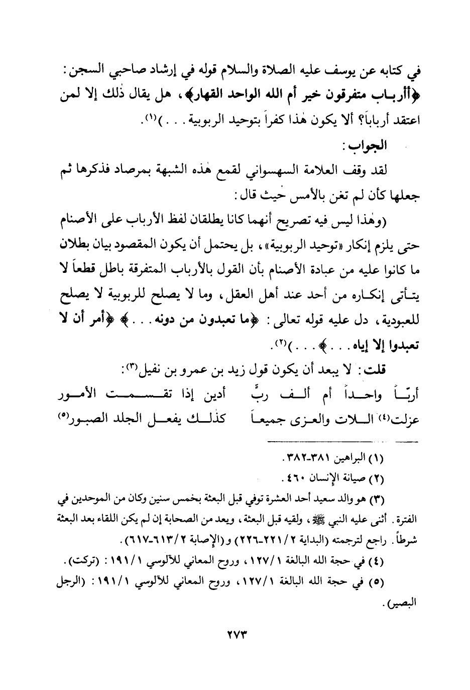 في كتابه عن يوسف عليه الصلاة والسلام قوله في إرشاد صاحبي السجن: {أَأَرْبَابٌ مُتَفَرِّقُونَ خَيْرٌ أَمِ اللَّهُ الْوَاحِدُ الْقَهَّارُ} ، هل يقال ذلك إلا لمن اعتقد أربابًا؟ ألا يكون هذا كفرًا بتوحيد الربوبية ... ) .