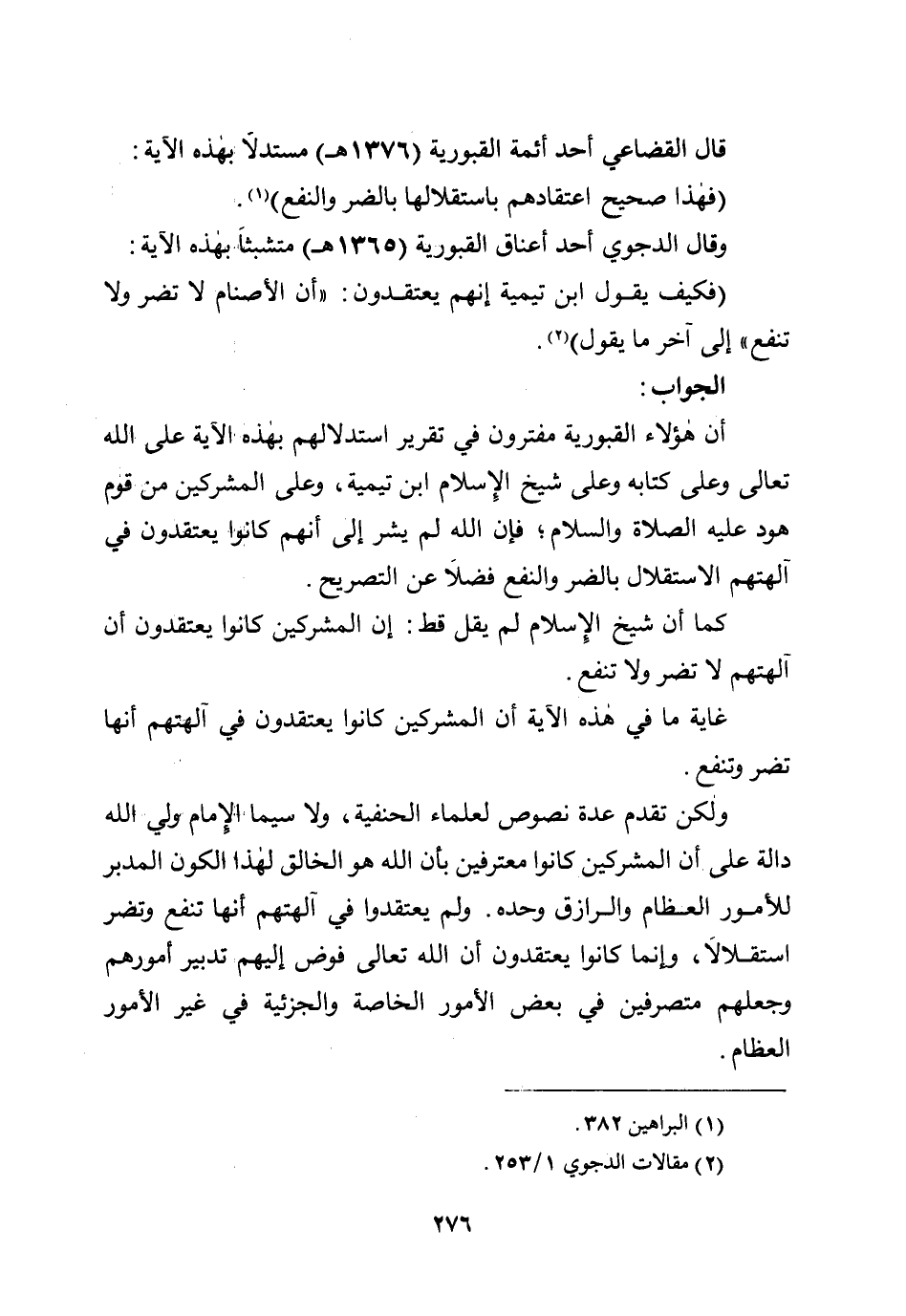 ولكن تقدم عدة نصوص لعلماء الحنفية، ولا سيما الإمام ولي الله دالة على أن المشركين كانوا معترفين بأن الله هو الخالق لهذا الكون المدبر للأمور العظام والرازق وحده. ولم يعتقدوا في آلهتهم أنها تنفع وتضر استقلالًا، وإنما كانوا يعتقدون أن الله تعالى فوض إليهم تدبير أمورهم وجعلهم متصرفين في بعض الأمور الخاصة والجزئية في غير الأمور العظام.