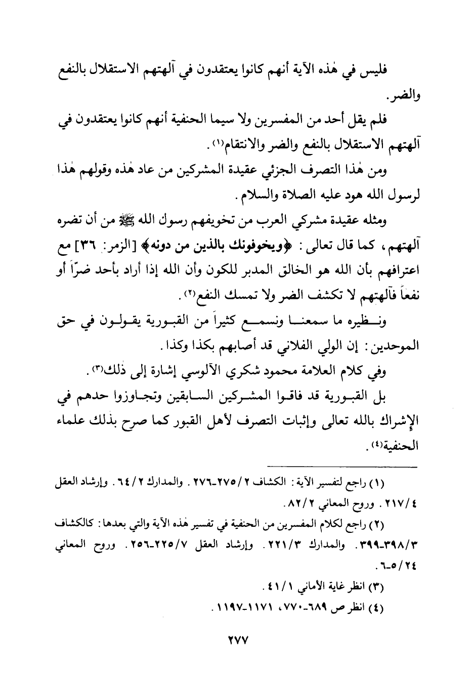 فلم يقل أحد من المفسرين ولا سيما الحنفية أنهم كانوا يعتقدون في آلهتهم الاستقلال بالنفع والضر والانتقام.