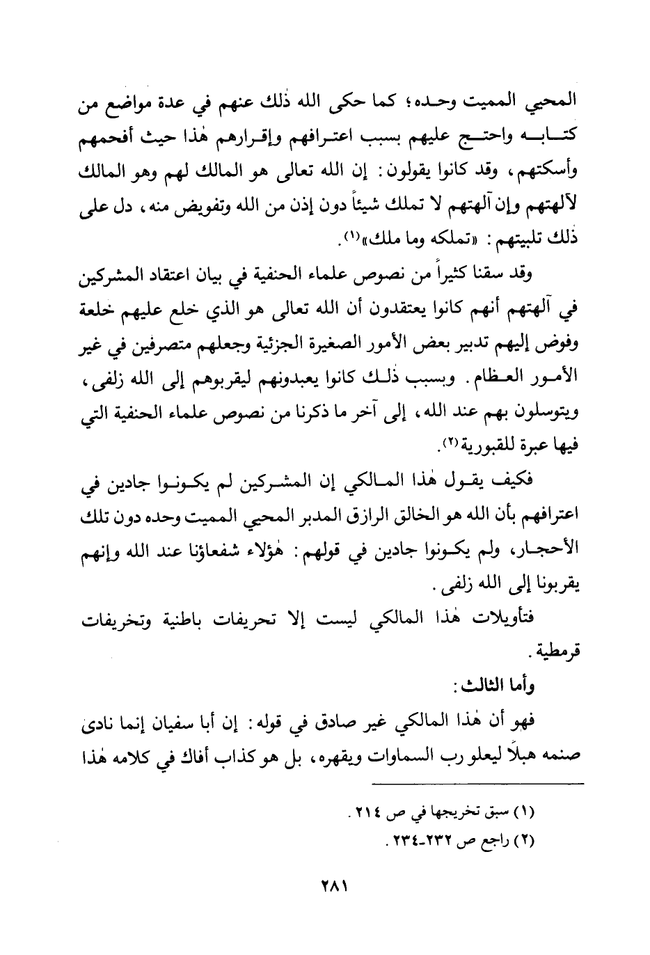 فكيف يقول هذا المالكي إن المشركين لم يكونوا جادين في اعترافهم بأن الله هو الخالق الرازق المدبر المحيي المميت وحده دون تلك الأحجار، ولم يكونوا جادين في قولهم: هؤلاء شفعاؤنا عند الله وإنهم يقربونا إلى الله زلفى.