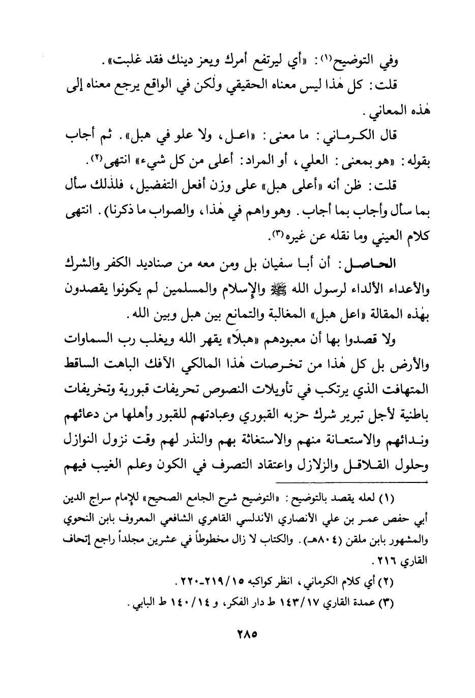 ولا قصدوا بها أن معبودهم ((هبلا)) يقهر الله ويغلب رب السماوات والأرض بل كل هذا من ترخصات هذا المالكي الآفك الباهت الساقط المتهافت الذي يرتكب في تأويلات النصوص تحريفات قبورية وتخريفات باطنية لأجل تبرير شرك حزبه القبوري وعبادتهم للقبور وأهلها من دعائهم وندائهم والاستعانة منهم والاستغاثة بهم والنذر لهم وقت نزول النوازل وحلول القلاقل والزلازل، واعتقاد التصرف في الكون وعلم الغيب فيهم،