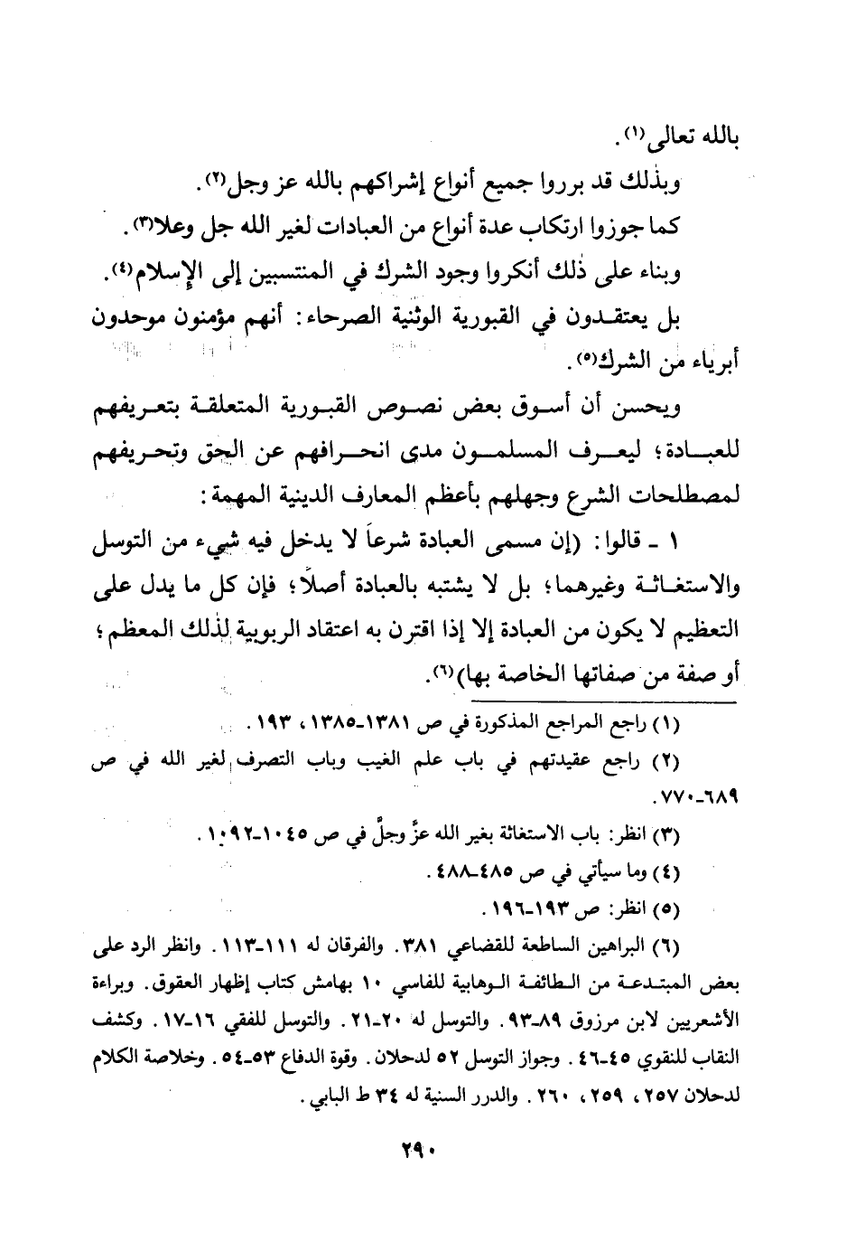 1 - قالوا: (إن مسمى العبادة شرعًا لا يدخل فيه شيء من التوسل والاستغاثة وغيرهما؛ بل لا يشتبه بالعبادة أصلًا؛ فإن كل ما يدل على التعظيم لا يكون من العبادة إلا إذا اقترن به اعتقاد الربوبية لذلك المعظم؛ أو صفة من صفاتها الخاصة بها) .