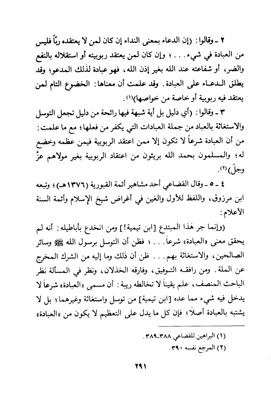 (وإنما جر هذا المبتدع [ابن تيمية!] ومن انخدع بأباطيله: أنه لم يحقق معنى ((العبادة)) شرعًا ... ؛ فظن أن التوسل برسول الله صلى الله عليه وسلم وسائر الصالحين، والاستغاثة بهم.... ظن أن ذلك وما إليه من الشرك المخرج عن الملة. ومن رافقه التوفيق، وفارقه الخذلان، ونظر في المسألة نظر الباحث المنصف، علم يقينًا لا تخالطه ريبة: أن مسمى ((العبادة)) شرعًا لا يدخل فيه شيء مما عده [ابن تيمية] من توسل واستغاثة وغيرهما؛ بل لا يشتبه بالعبادة أصلًا؛ فإن كل ما يدل على التعظيم لا يكون من ((العبادة))