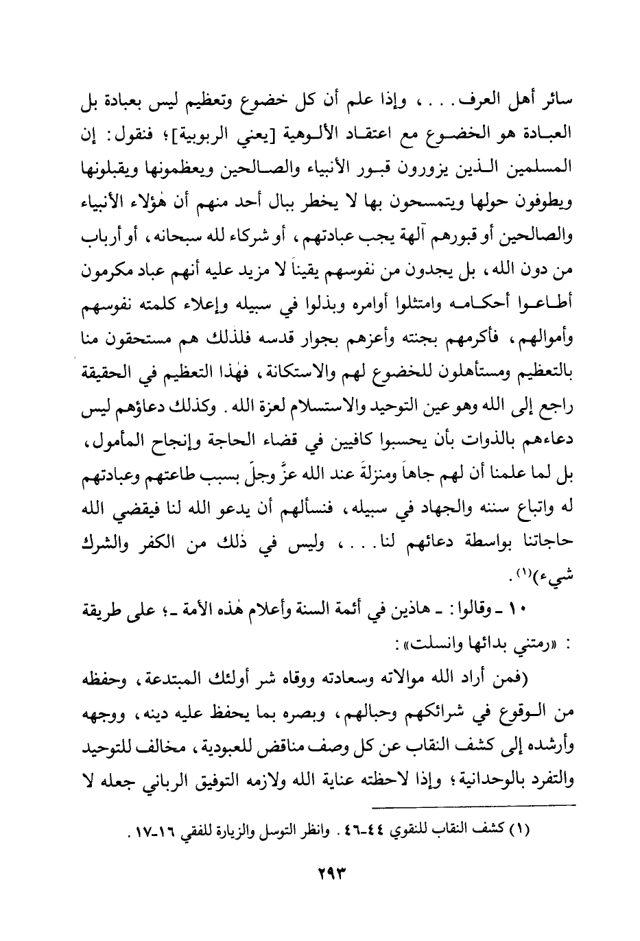 سائر أهل العرف....، وإذا علم أن كل خضوع وتعظيم ليس بعبادة بل العبادة هو الخضوع مع اعتقاد الألوهية [يعني الربوبية] ؛ فنقول: إن المسلمين الذين يزورون قبور الأنبياء والصالحين ويعظمونها ويقبلونها ويطوفون حولها ويتمسحون بها لا يخطر ببال أحد منهم أن هؤلاء الأنبياء والصالحين أو قبورهم آلهة يجب عبادتهم، أو شركاء لله سبحانه، أو أرباب من دون الله، بل يجدون من نفوسهم يقينًا لا مزيد عليه أنهم عباد مكرمون أطاعوا أحكامه وامتثلوا أوامره وبذلوا في سبيله وإعلاء كلمته نفوسهم وأموالهم، فأكرمهم بجنته وأعزهم بجوار قدسه فلذلك هم مستحقون منا بالتعظيم ومستأهلون للخضوع لهم والاستكانة، فهذا التعظيم في الحقيقة راجع إلى الله وهو عين التوحيد والاستسلام لعزة الله. وكذلك دعاؤهم ليس دعاءهم بالذوات بأن يحسبوا كافيين في قضاء الحاجة وإنجاح المأمول، بل لما علمنا أن لهم جاهًا ومنزلة عند الله عز وجل بسبب طاعتهم وعبادتهم له واتباع سننه والجهاد في سبيله، فنسألهم أن يدعو الله لنا فيقضي الله حاجاتنا بواسطة دعائهم لنا ... ، وليس في ذلك من الكفر والشرك شيء) .