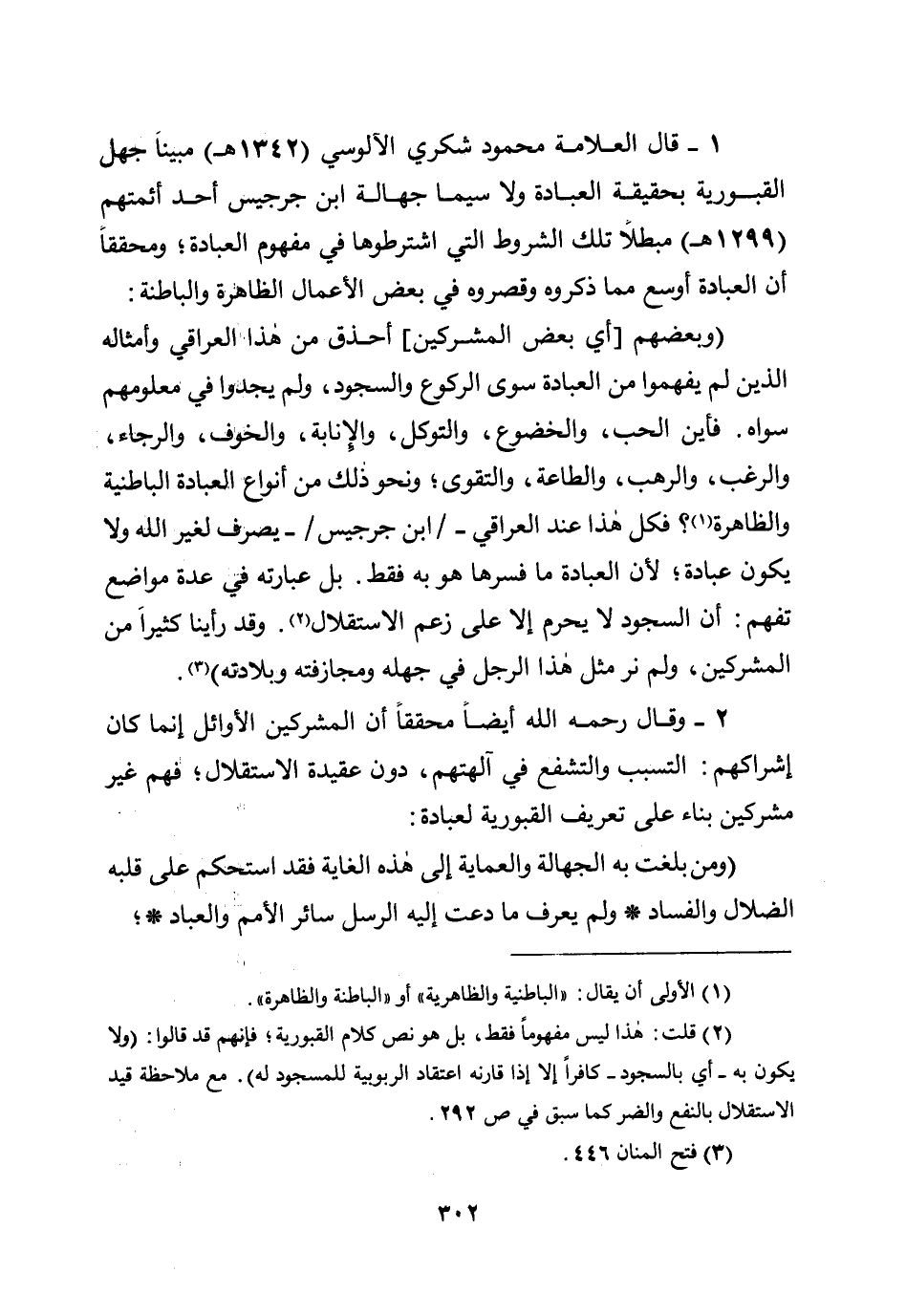 1 - قال العلامة محمود شكري الآلوسي (1342هـ) مبينًا جهل القبورية بحقيقة العبادة ولا سيما جهالة ابن جرجيس أحد أئمتهم (1299هـ) مبطلًا تلك الشروط التي اشترطوها في مفهوم العبادة؛ ومحققًا أن العبادة أوسع مما ذكروه وقصروه في بعض الأعمال الظاهرة والباطنة: