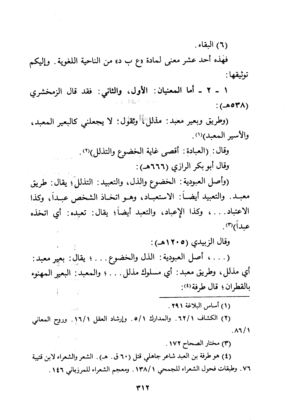 (......، أصل العبودية: الذل والخضوع....؛ يقال: بعير معبد: أي مذلل، وطريق معبد: أي مسلوك مذلل.....؛ والمعبد: البعير المهنوء بالقطران؛ قال طرفة: