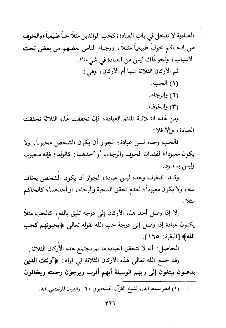 إلا إذا وصل أحد هذه الأركان إلى درجة تليق بالله، كالحب مثلًا يكون عبادة إذا وصل إلى درجة حب الله لقوله تعالى: {يُحِبُّونَهُمْ كَحُبِّ اللَّهِ} [البقرة: 165] .