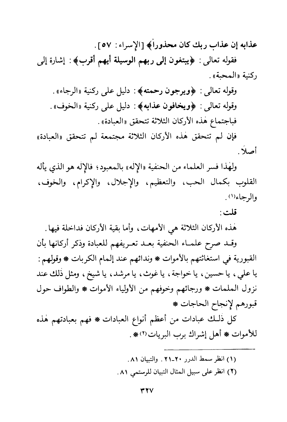 وقد صرح علماء الحنفية بعد تعريفهم للعبادة وذكر أركانها بأن القبورية في استغاثتهم بالأموات * وندائهم عند إلمام الكربات * وقولهم: يا علي، يا حسين، يا خواجة، يا غوث، يا مرشد، يا شيخ، ومثل ذلك عند نزول الملمات * ورجائهم وخوفهم من الأولياء الأموات * والطواف حول قبورهم لإنجاح الحاجات *