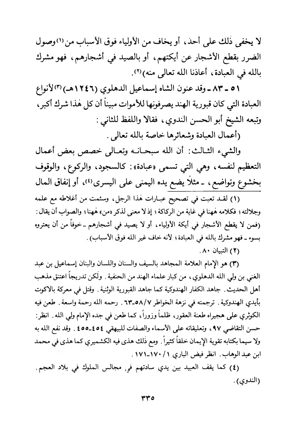 51 - 83 - وقد عنون الشاه إسماعيل الدهلوي (1246هـ) لأنواع العبادة التي كان قبورية الهند يصرفونها للأموات مبينًا أن كل هذا شرك أكبر، وتبعه الشيخ أبو الحسن الندوي، فقالا واللفظ للثاني: