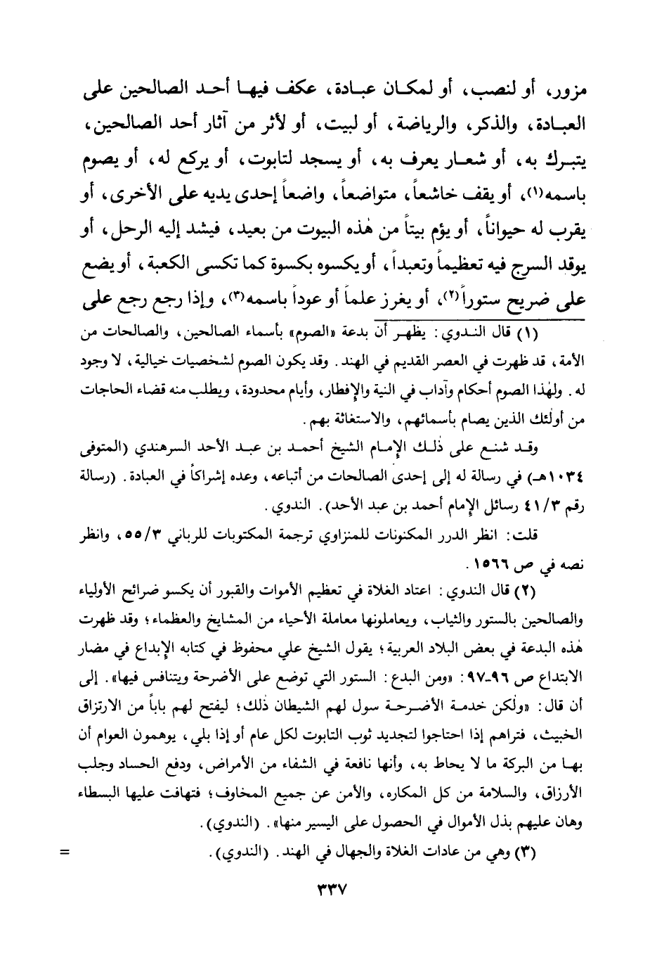 نزور، أو لنصب، أو لمكان عبادة، عكف فيها أحد الصالحين على العبادة، والذكر، والرياضة، أو لبيت، أو لأثر من آثار أحد الصالحين، يتبرك به، أو شعار يعرف به، أو يسجد لتابوت، أو يركع له، أو يصوم باسمه، أو يقف خاشعًا، متواضعًا، واضعًا إحدى يديه على الأخرى، أو يقرب له حيوانًا، أو يؤم بيتًا من هذه البيوت من بعيد، فيشد إليه الرحل، أو يوقد السرج فيه تعظيمًا وتعبدًا، أو يكسوه بكسوة كما تكسى الكعبة، أو يضع على ضريح ستورًا، أو يغرز علمًا أو عودًا باسمه، وإذا رجع رجع على