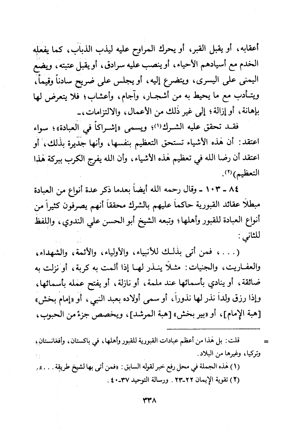 84 - 103 - وقال رحمه الله أيضًا بعدما ذكر عدة أنواع من العبادة مبطلًا عقائد القبورية حاكمًا عليهم بالشرك محققًا أنهم يصرفون كثيرًا من أنواع العبادة للقبور وأهلها؛ وتبعه الشيخ أبو الحسن علي الندوي، واللفظ للثاني:
