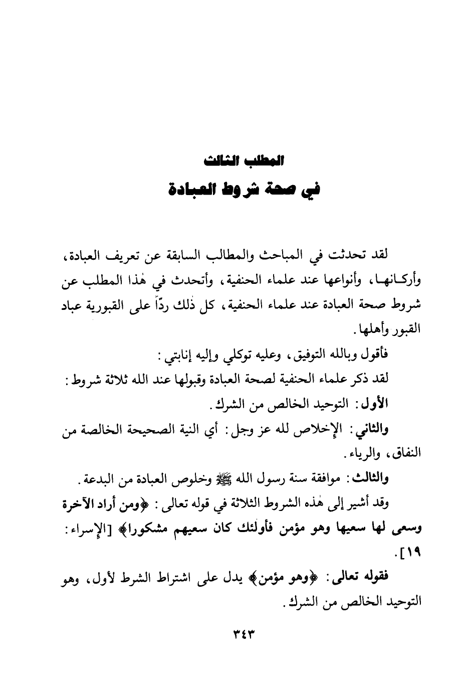لقد تحدثت في المباحث والمطالب السابقة عن تعريف العبادة، وأركانها، وأنواعها عند علماء الحنفية، وأتحدث في هذا المطلب عن شروط صحة العبادة عند علماء الحنفية، كل ذلك ردا على القبورية عباد القبور وأهلها.