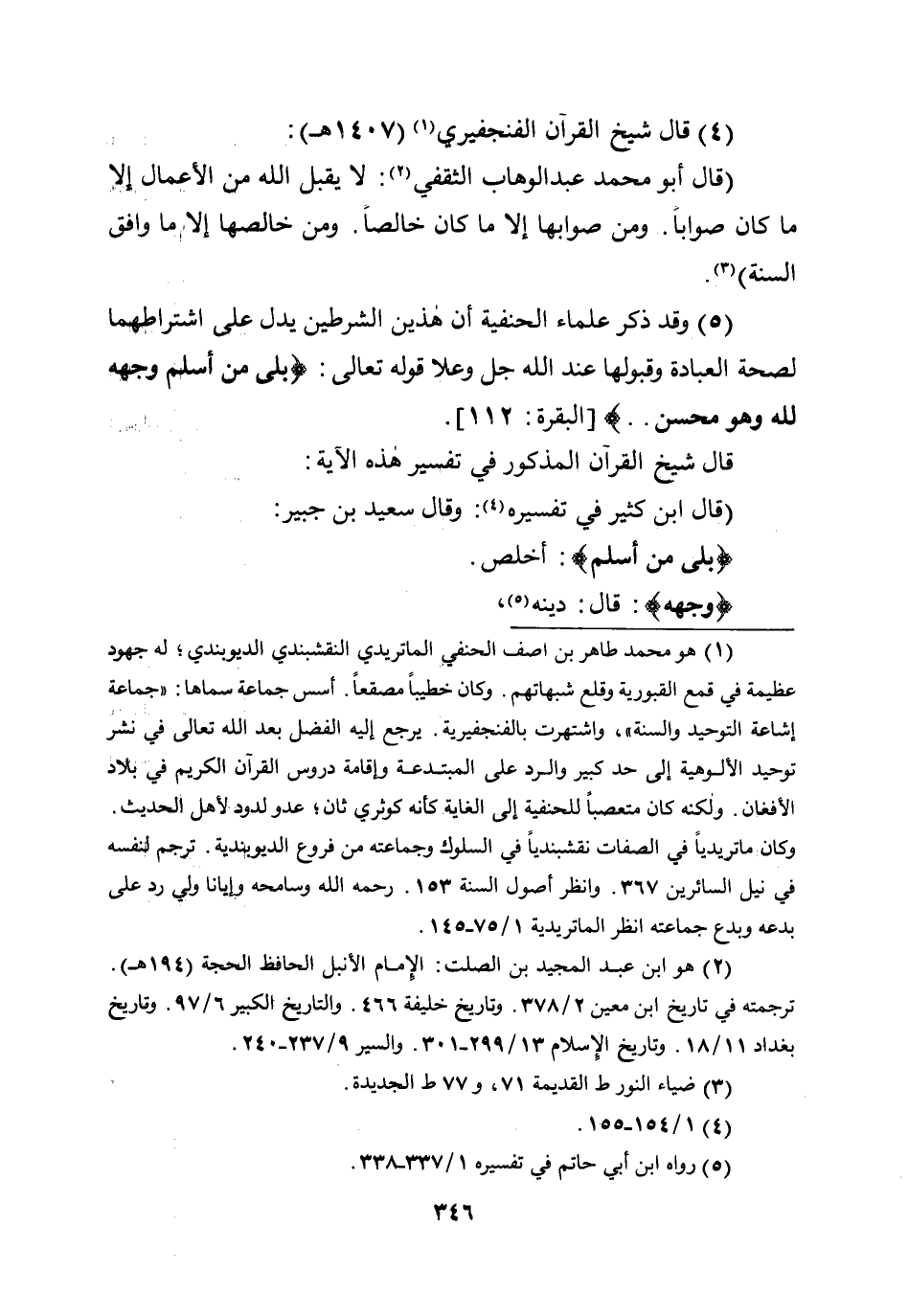 (5) وقد ذكر علماء الحنفية أن هذين الشرطين يدل على اشتراطهما لصحة العبادة وقبولها عند الله جل وعلا قوله تعالى: {بَلَى مَنْ أَسْلَمَ وَجْهَهُ لِلَّهِ وَهُوَ مُحْسِنٌ} ... [البقرة: 112] .