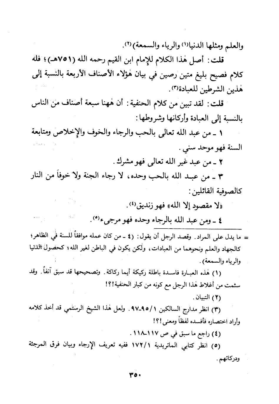 قلت: أصل هذا الكلام للإمام ابن القيم رحمه الله (751هـ) ؛ فله كلام فصيح بليغ متين رصين في بيان هؤلاء الأصناف الأربعة بالنسبة إلى هذين الشرطين للعبادة.