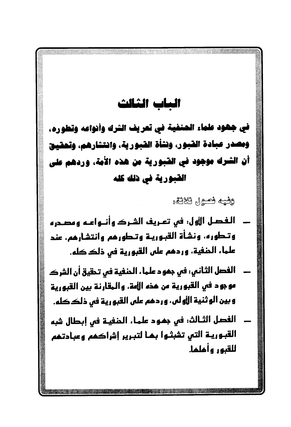 - الفصل الأول: في تعريف الشرك وأنواعه ومصدره وتطوره، ونشأة القبورية وتطورهم وانتشارهم، عند علماء الحنفية وردهم على القبورية في ذلك كله.