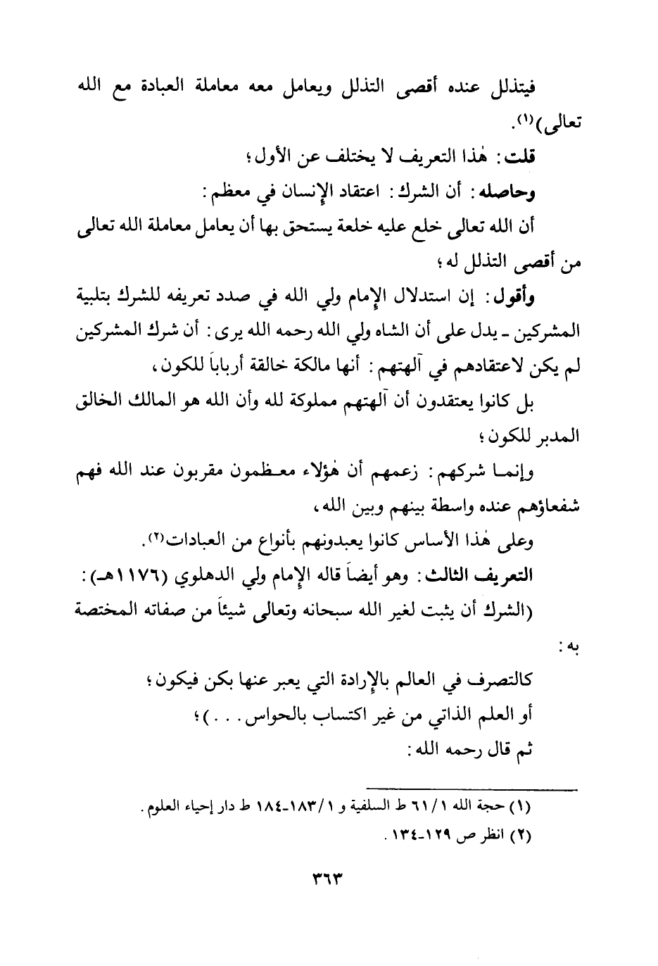 أن الله تعالى خلع عليه خلعة يستحق بها أن يعامل معاملة الله تعالى من أقصى التذلل له؛ وأقول: إن استدلال الإمام ولي الله في صدد تعريفه للشرك بتلبية المشركين - يدل على أن الشاه ولي الله رحمه الله يرى: أن شرك المشركين لم يكن لاعتقادهم في آلهتهم: أنها مالكة خالقة أربابًا للكون، بل كانوا يعتقدون أن آلهتهم مملوكة لله وأن الله هو المالك الخالق المدبر للكون؛ وإنما شركهم: زعمهم أن هؤلاء معظمون مقربون عند الله فهم شفعاؤهم عنده واسطة بينهم وبين الله، وعلى هذا الأساس كانوا يعبدونهم بأنواع من العبادات.