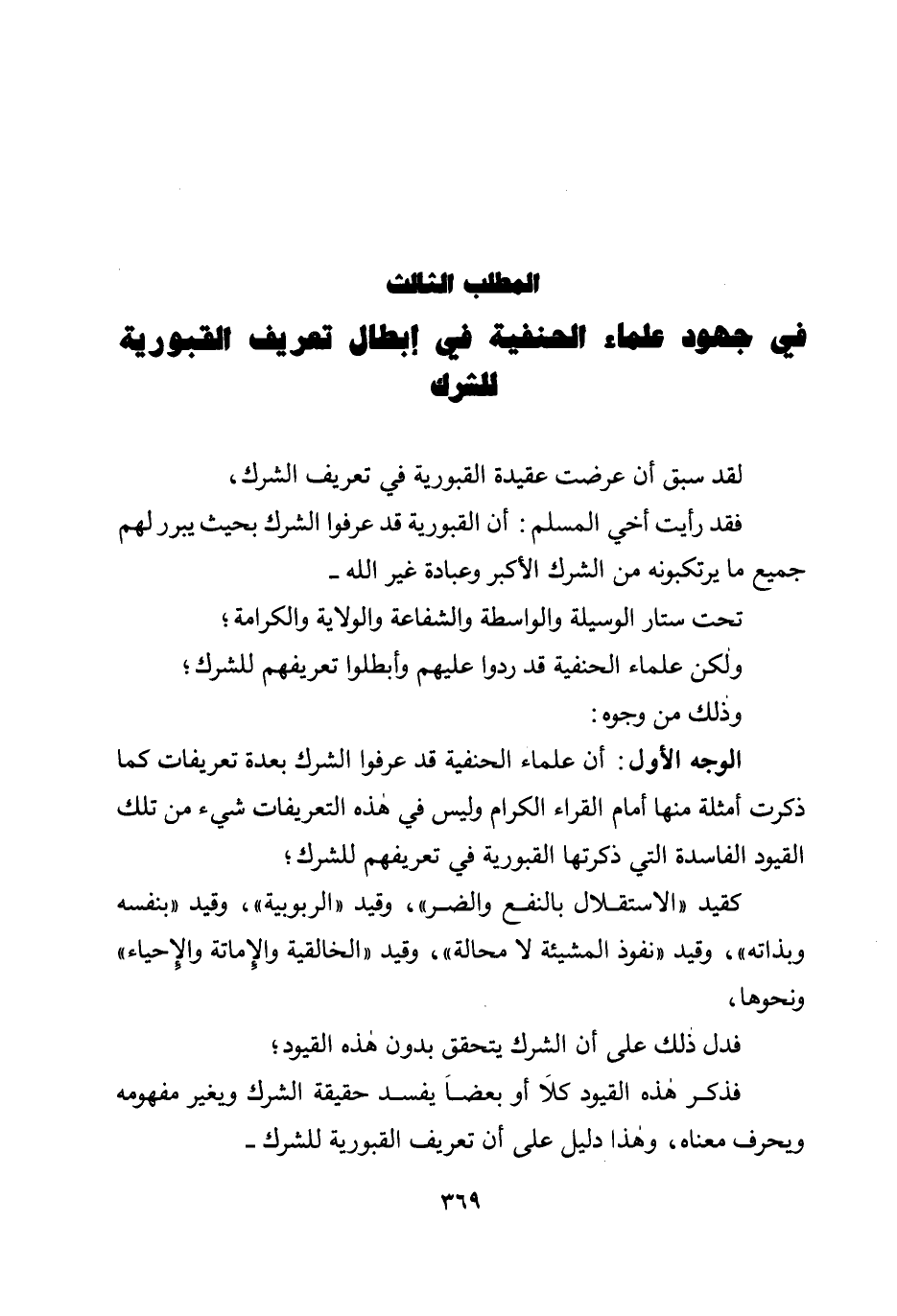 الوجه الأول: أن علماء الحنفية قد عرفوا الشرك بعدة تعريفات كما ذكرت أمثلة منها أمام القراء الكرام وليس في هذه التعريفات شيء من تلك القيود الفاسدة التي ذكرتها القبورية في تعريفهم للشرك؛ كقيد ((الاستقلال بالنفع والضر)) ، وقيد ((الربوبية)) ، وقيد ((بنفسه وبذاته)) ، وقيد ((نفوذ المشيئة لا محالة)) ، وقيد ((الخالقية والإماتة والإحياء)) ونحوها، فدل ذلك على أن الشرك يتحقق بدون هذه القيود؛ فذكر هذه القيود كلا أو بعضًا يفسد حقيقة الشرك ويغير مفهومه ويحرف معناه، وهذا دليل على أن تعريف القبورية للشرك -