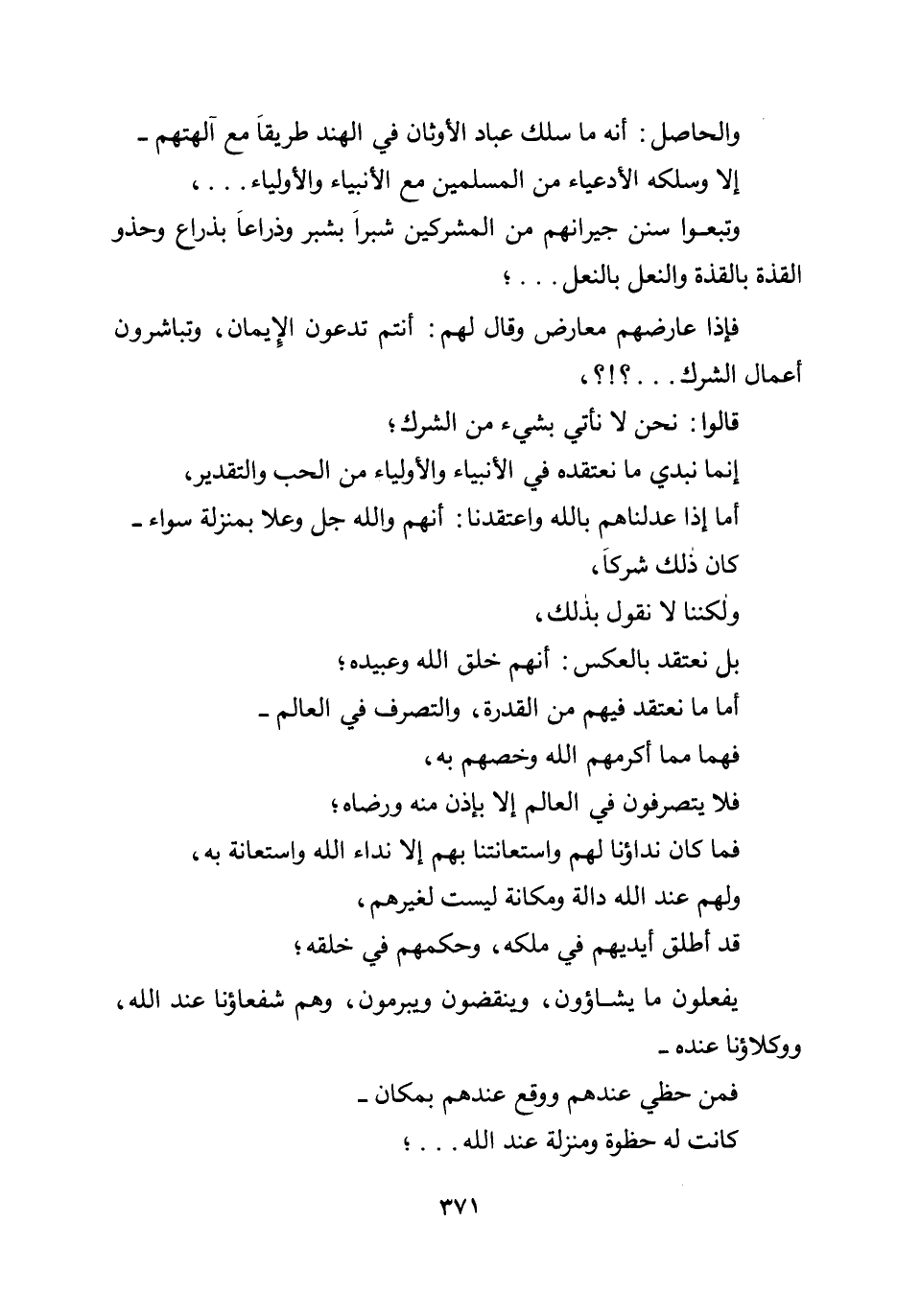 والحاصل: أنه ما سلك عباد الأوثان في الهند طريقًا مع آلهتهم - إلا وسلكه الأدعياء من المسلمين مع الأنبياء والأولياء ... ، وتبعوا سنن جيرانهم من المشركين شبرًا بشبر وذراعًا بذراع وحذو القذة بالقذة والنعل بالنعل ... ؛ فإذا عارضهم معارض وقال لهم: أنتم تدعون الإيمان، وتباشرون أعمال الشرك ... ؟!؟ ، قالوا: نحن لا نأتي بشيء من الشرك؛ إنما نبدي ما نعتقده في الأنبياء والأولياء من الحب والتقدير، أما إذا عدلناهم بالله واعتقدنا: أنهم والله جل وعلا بمنزلة سواء - كان ذلك شركًا، ولكننا لا نقول بذلك، بل نعتقد بالعكس: أنهم خلق الله وعبيده؛ أما ما نعتقد فيهم من القدرة، والتصرف في العالم - فهما مما أكرمهم الله وخصهم به، فلا يتصرفون في العالم إلا بإذن منه ورضاه؛ فما كان نداؤنا لهم واستعانتنا بهم إلا نداء الله واستعانة به، ولهم عند الله دالة ومكانة ليست لغيرهم، قد أطلق أيديهم في ملكه، وحكمهم في خلقه؛ يفعلون ما يشاءون، وينقضون ويبرمون، وهم شفعاؤنا عند الله، ووكلاؤنا عنده - فمن حظي عندهم ووقع عندهم بمكان - كانت له حظوة ومنزلة عند الله ... ؛