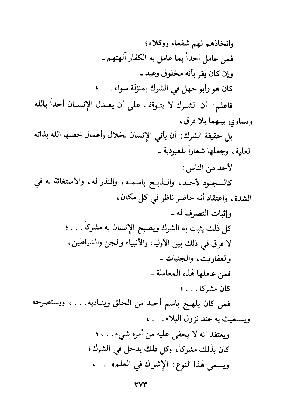 واتخاذهم لهم شفعاء ووكلاء؛ فمن عامل أحدًا بما عامل به الكفار آلهتهم - وإن كان يقر بأنه مخلوق وعبد - كان هو وأبو جهل في الشرك بمنزلة سواء....؛ فاعلم: أن الشرك لا يتوقف على أن يعدل الإنسان أحدًا بالله ويساوي بينهما بلا فرق، بل حقيقة الشرك: أن يأتي الإنسان بخلال وأعمال خصها الله بذاته العلية، وجعلها شعارًا للعبودية - لأحد من الناس: