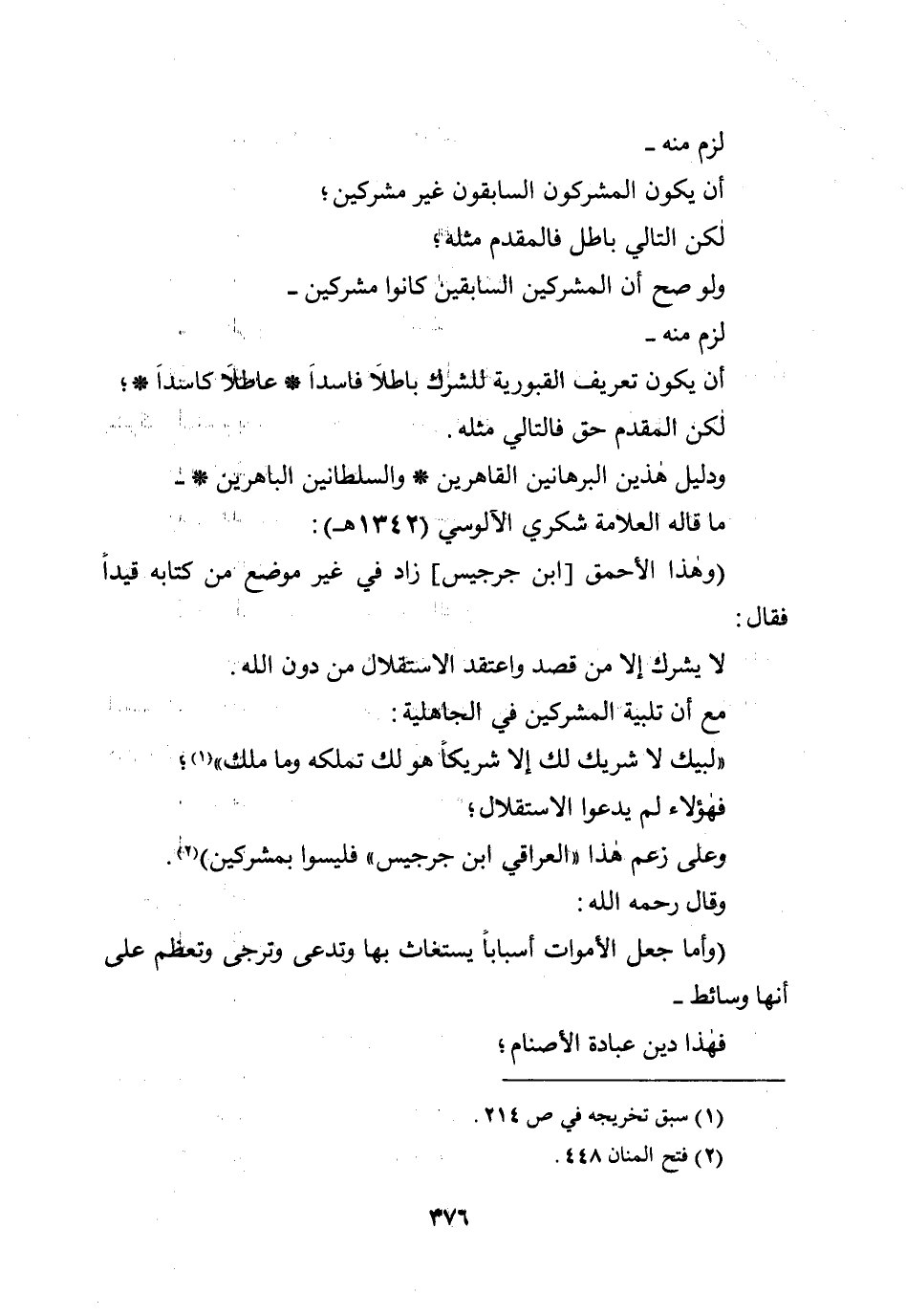 ((لبيك لا شريك لك إلا شريكًا هو لك تملكه وما ملك)) ؛ فهؤلاء لم يدعوا الاستقلال؛ وعلى زعم هذا ((العراقي ابن جرجيس)) فليسوا بمشركين) .