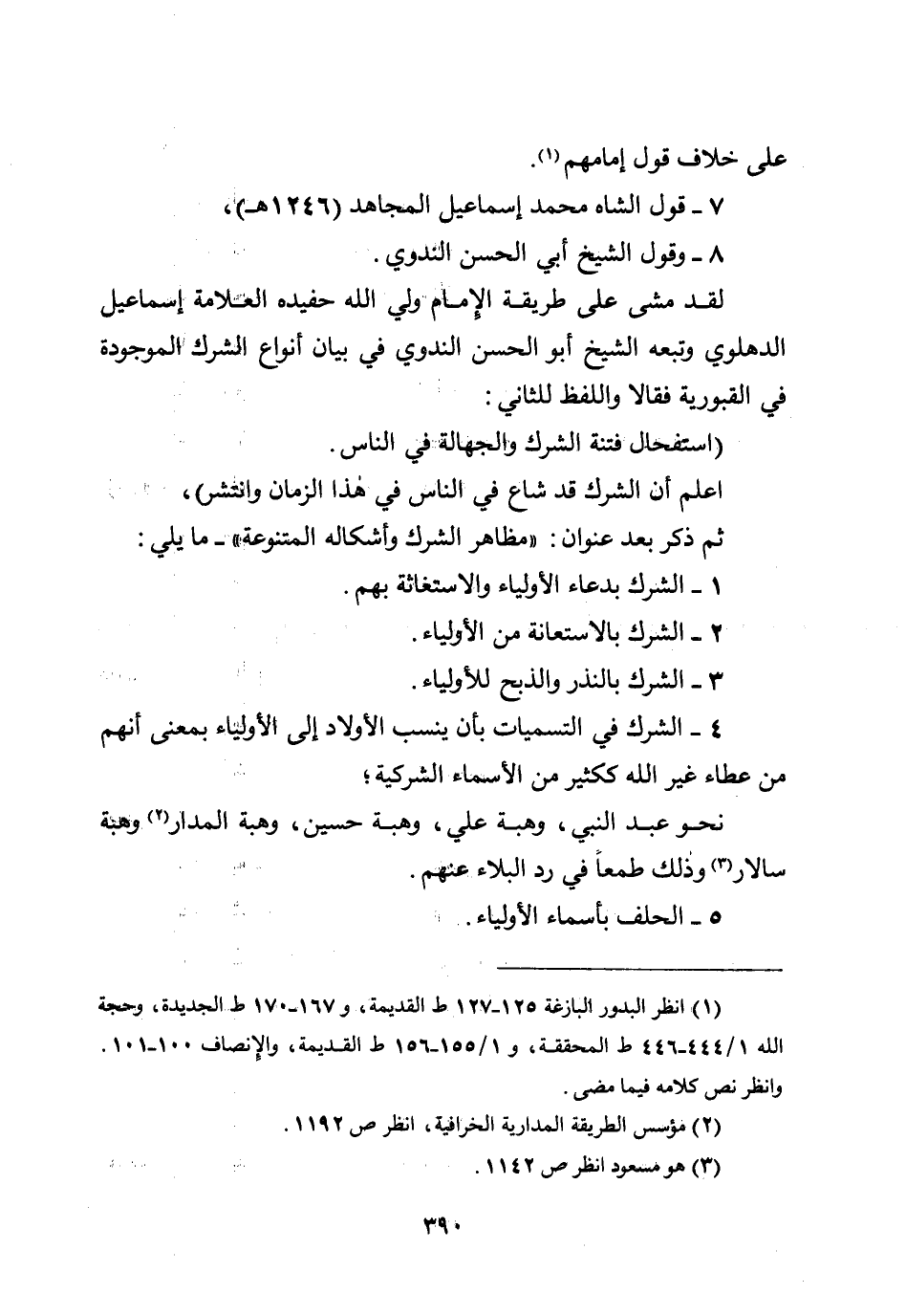 لقد مشى على طريقة الإمام ولي الله حفيده العلامة إسماعيل الدهلوي وتبعه الشيخ أبو الحسن الندوي في بيان أنواع الشرك الموجودة في القبورية فقالا واللفظ للثاني:
