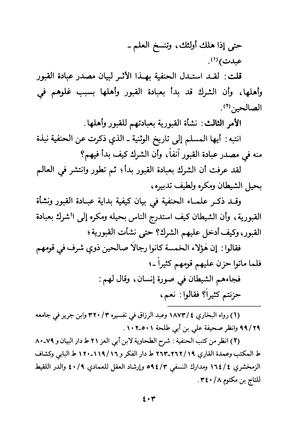 وقد ذكر علماء الحنفية في بيان كيفية بداية عبادة القبور ونشأة القبورية، وأن الشيطان كيف استدرج الناس بحيله ومكره إلى الشرك بعبادة القبور، وكيف أدخل عليهم الشرك؟ حتى نشأت القبورية؛ فقالوا: إن هؤلاء الخمسة كانوا رجالًا صالحين ذوي شرف في قومهم فلما ماتوا حزن عليهم قومهم كثيرًا -؛ فجاءهم الشيطان في صورة إنسان، وقال لهم: