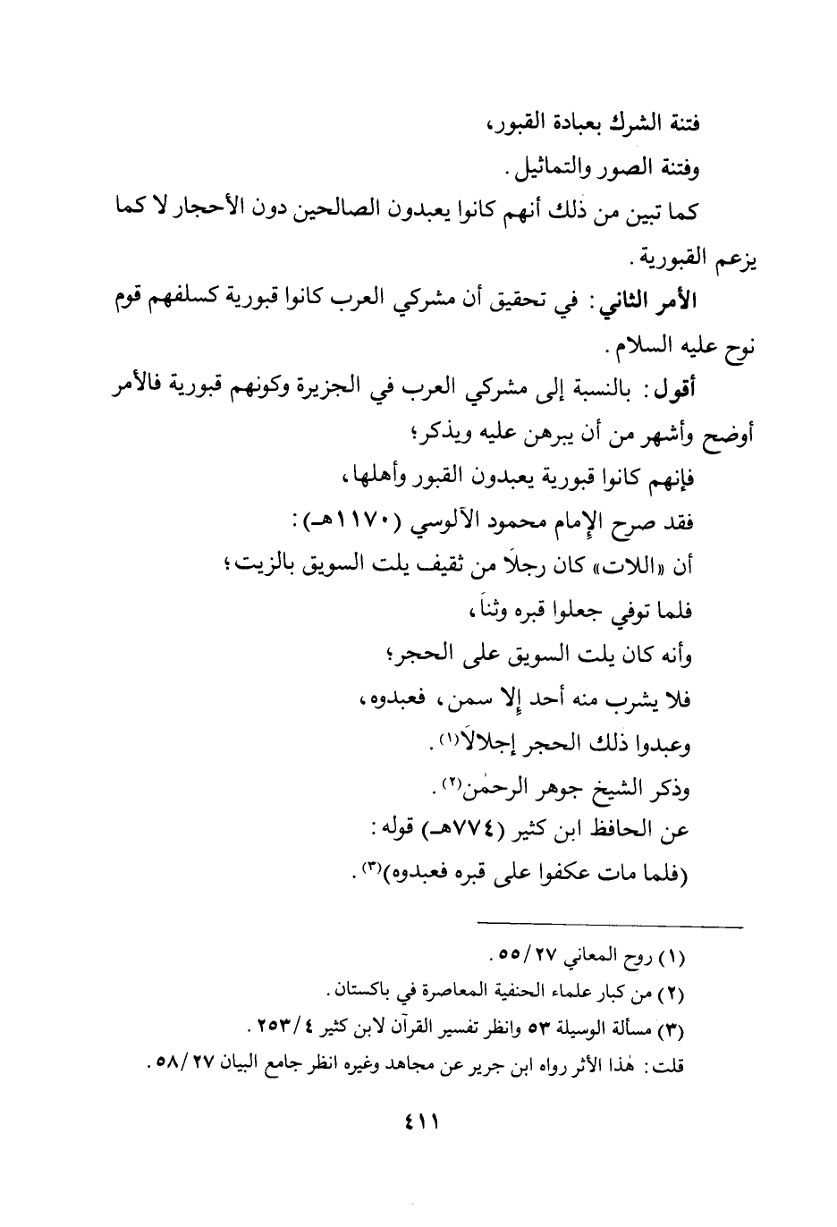 أقول: بالنسبة إلى مشركي العرب في الجزيرة وكونهم قبورية فالأمر أوضح وأشهر من أن يبرهن عليه ويذكر؛ فإنهم كانوا قبورية يعبدون القبور وأهلها، فقد صرح الإمام محمود الآلوسي (1170هـ) :