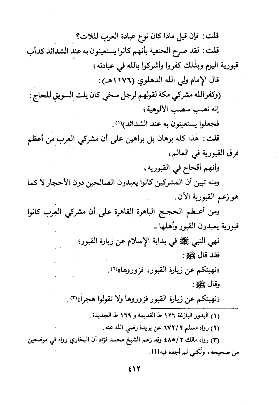 قلت: هذا كله برهان بل براهين على أن مشركي العرب من أعظم فرق القبورية في العالم، وأنهم أقحاح في القبورية، ومنه تبين أن المشركين كانوا يعبدون الصالحين دون الأحجار لا كما هو زعم القبورية الآن.