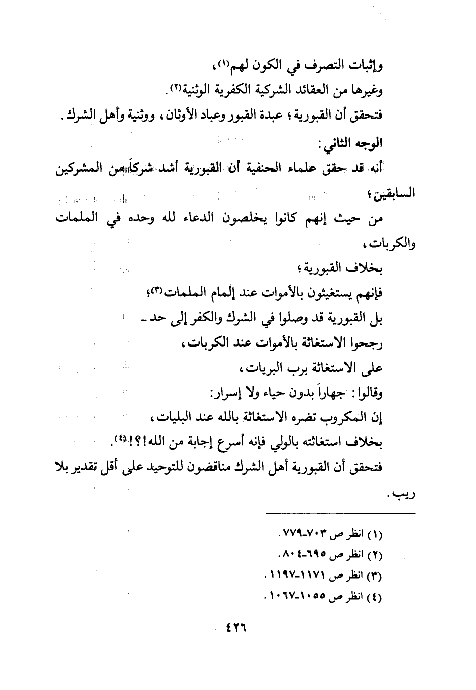 أنه قد حقق علماء الحنفية أن القبورية أشد شركًا من المشركين السابقين؛ من حيث إنهم كانوا يخلصون الدعاء لله وحده في الملمات والكربات، بخلاف القبورية؛ فإنهم يستغيثون بالأموات عند إلمام الملمات؛ بل القبورية قد وصلوا في الشرك والكفر إلى حد - رجحوا الاستغاثة بالأموات عند الكربات، على الاستغاثة برب البريات، وقالوا: جهارًا بدون حياء ولا إسرار: