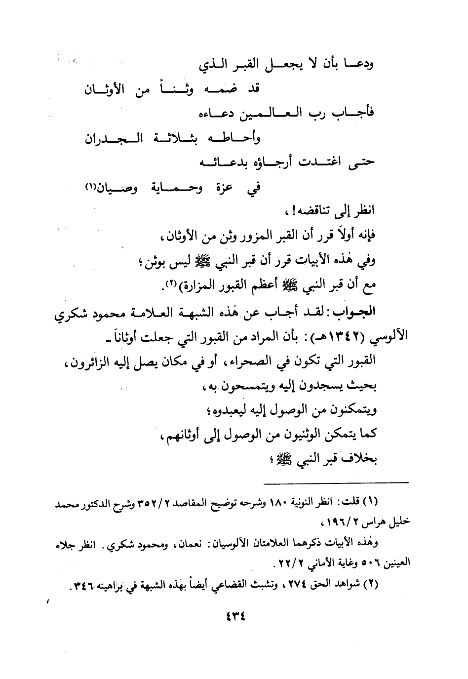 انظر إلى تناقضه! ، فإنه أولًا قرر أن القبر المزور وثن من الأوثان، وفي هذه الأبيات قرر أن قبر النبي صلى الله عليه وسلم ليس بوثن؛ مع أن قبر النبي صلى الله عليه وسلم أعظم القبور المزارة) .
