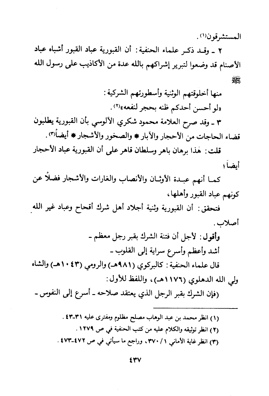 وأقول: لأجل أن فتنة الشرك بقبر رجل معظم - أشد وأعظم وأسرع سراية إلى القلوب - قال علماء الحنفية: كالبركوي (981هـ) والرومي (1043هـ) والشاه ولي الله الدهلوي (1176هـ) ، واللفظ للأول: