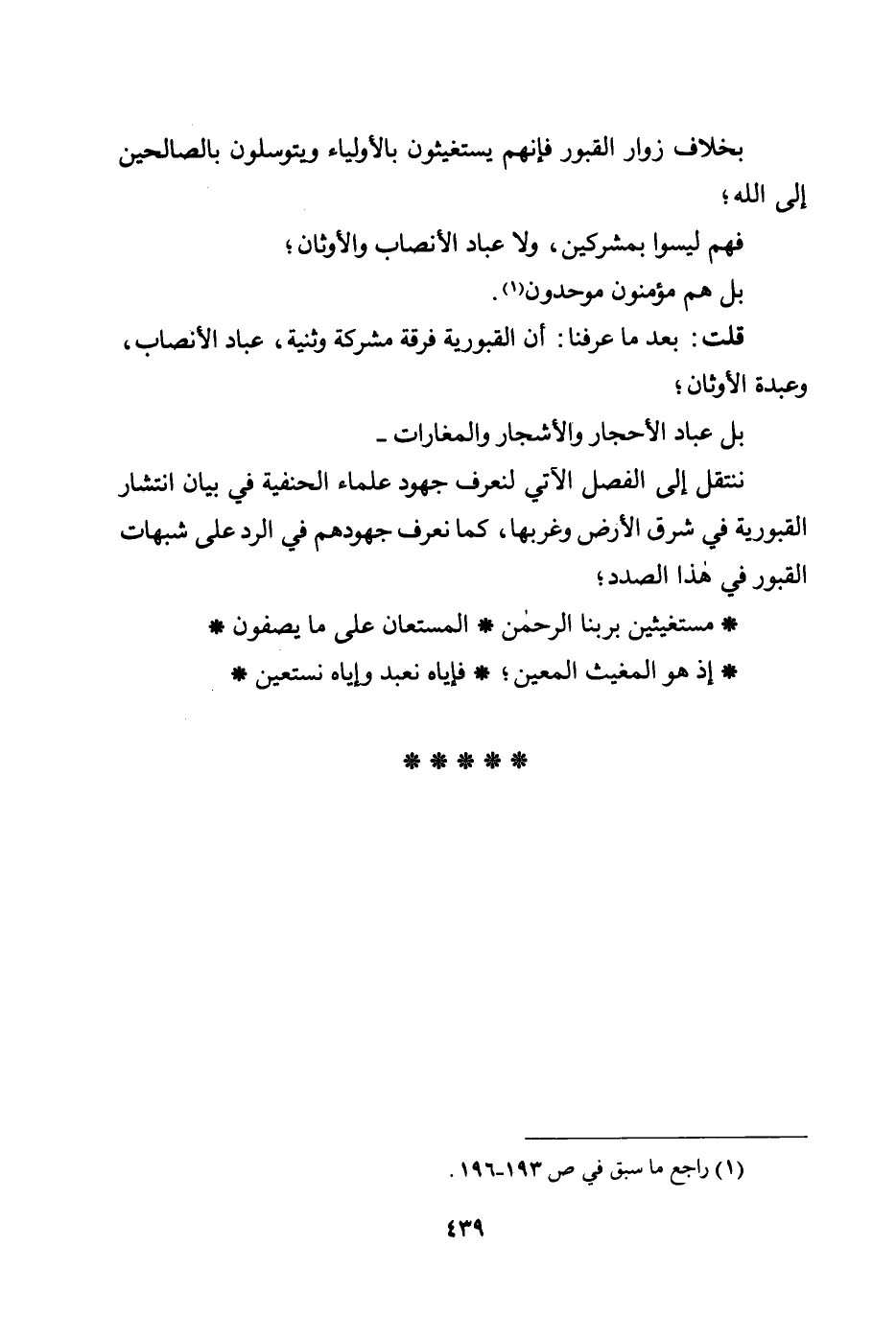 قلت: بعد ما عرفنا: أن القبورية فرقة مشركة وثنية، عباد الأنصاب، وعبدة الأوثان؛ بل عباد الأحجار والأشجار والمغارات - ننتقل إلى الفصل الآتي لنعرف جهود علماء الحنفية في بيان انتشار القبورية في شرق الأرض وغربها، كما نعرف جهودهم في الرد على شبهات القبور في هذا الصدد؛ * مستغيثين بربنا الرحمن * المستعان على ما يصفون *