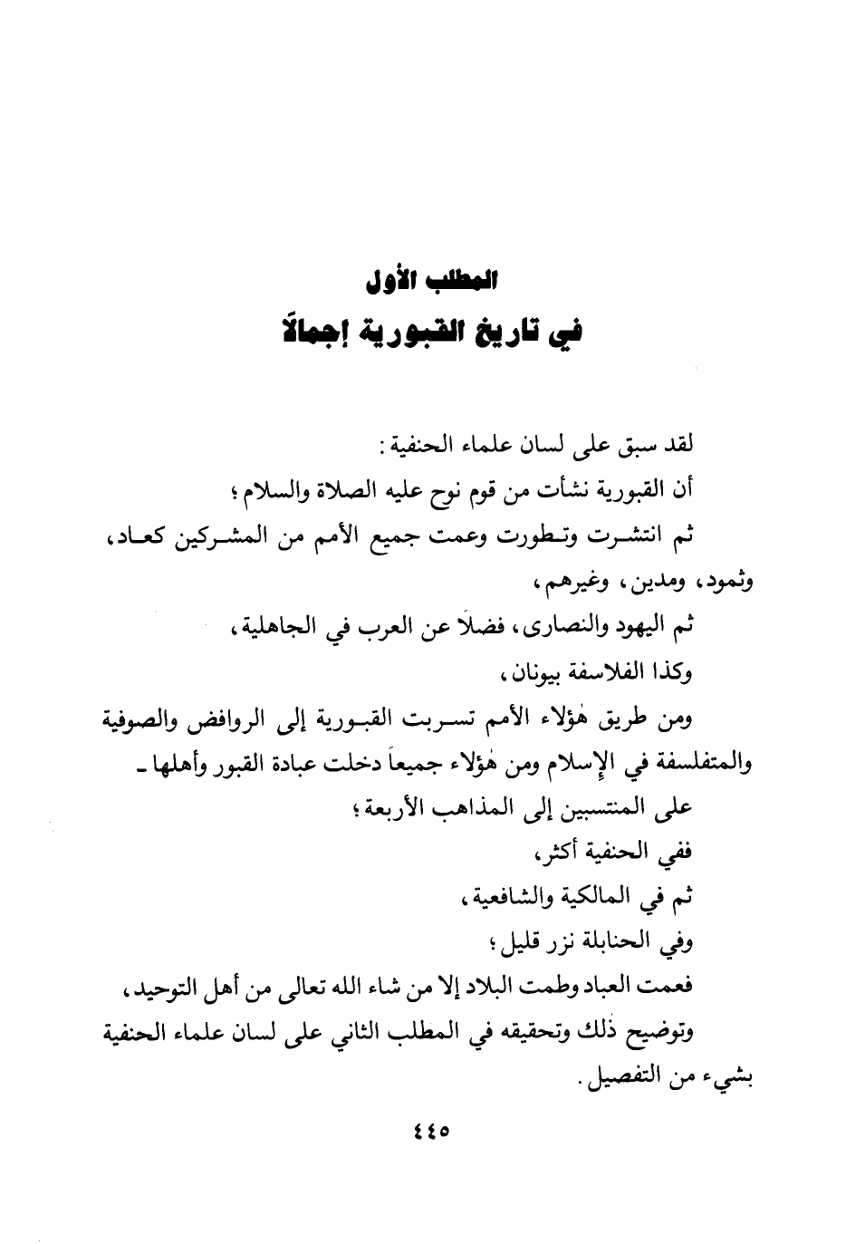 أن القبورية نشأت من قوم نوح عليه الصلاة والسلام؛ ثم انتشرت وتطورت وعمت جميع الأمم من المشركين كعاد، وثمود، ومدين، وغيرهم، ثم اليهود والنصارى، فضلًا عن العرب في الجاهلية، وكذا الفلاسفة بيونان، ومن طريق هؤلاء الأمم تسربت القبورية إلى الروافض والصوفية والمتفلسفة في الإسلام ومن هؤلاء جميعًا دخلت عبادة القبور وأهلها - على المنتسبين إلى المذاهب الأربعة؛ ففي الحنفية أكثر، ثم في المالكية والشافعية، وفي الحنابلة نزر قليل؛ فعمت العباد وطمت البلاد إلا من شاء الله تعالى من أهل التوحيد، وتوضيح ذلك وتحقيقه في المطلب الثاني على لسان علماء الحنفية بشيء من التفصيل.