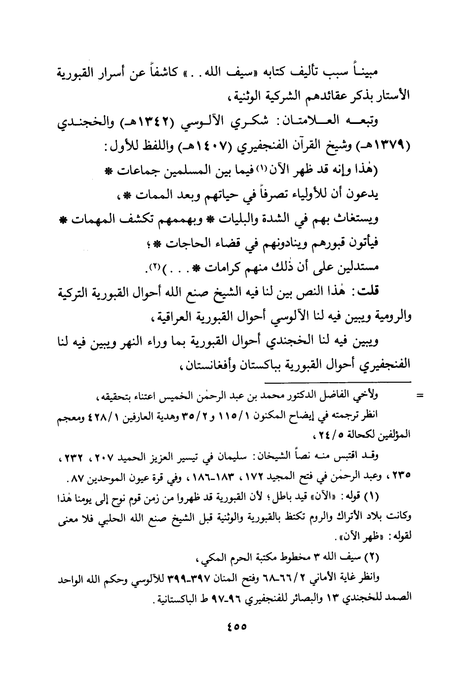 مبينًا سبب تأليف كتابه ((سيف الله ... )) كاشفًا عن أسرار القبورية الأستار بذكر عقائدهم الشركية الوثنية، وتبعه العلامتان: شكري الآلوسي (1342هـ) والخجندي (1379هـ) وشيخ القرآن الفنجفيري (1407هـ) واللفظ للأول: