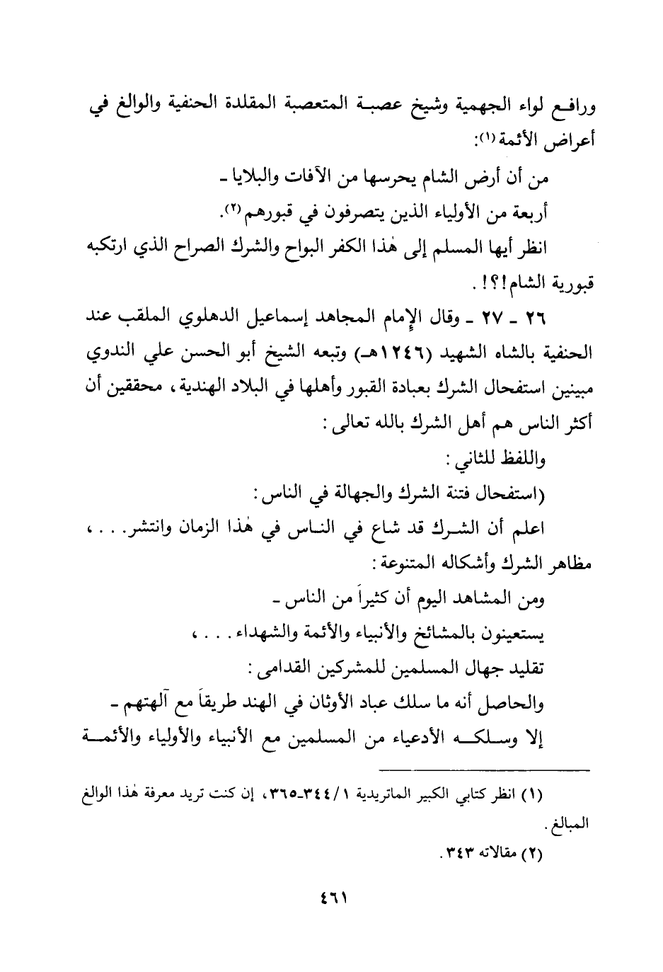26 - 27 - وقال الإمام المجاهد إسماعيل الدهلوي الملقب عند الحنفية بالشاه الشهيد (1246هـ) وتبعه الشيخ أبو الحسن علي الندوي مبينين استفحال الشرك بعبادة القبور وأهلها في البلاد الهندية، محققين أن أكثر الناس هم أهل الشرك بالله تعالى:
