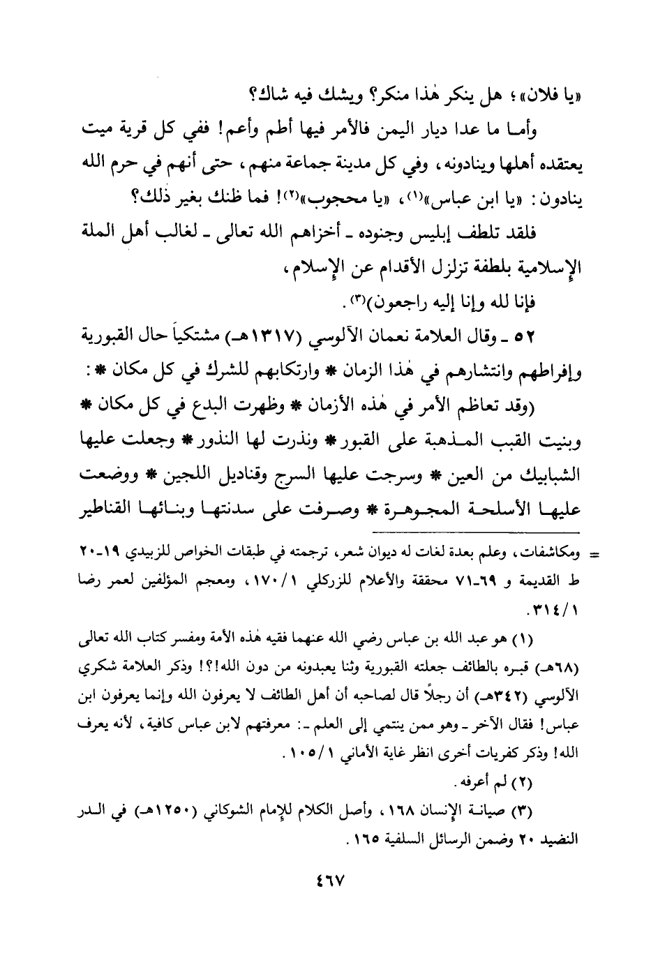 52 - وقال العلامة نعمان الآلوسي (1317هـ) مشتكيًا حال القبورية وإفراطهم وانتشارهم في هذا الزمان * وارتكابهم للشرك في كل مكان *: