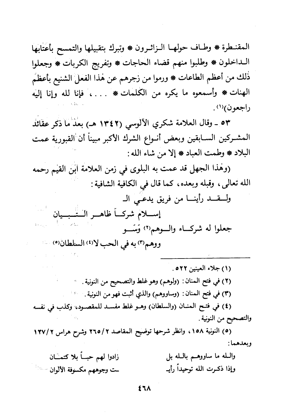 53 - وقال العلامة شكري الآلوسي (1342هـ) بعدما ذكر عقائد المشركين السابقين وبعض أنواع الشرك الأكبر مبينًا أن القبورية عمت البلاد * وطمت العباد * إلا من شاء الله: