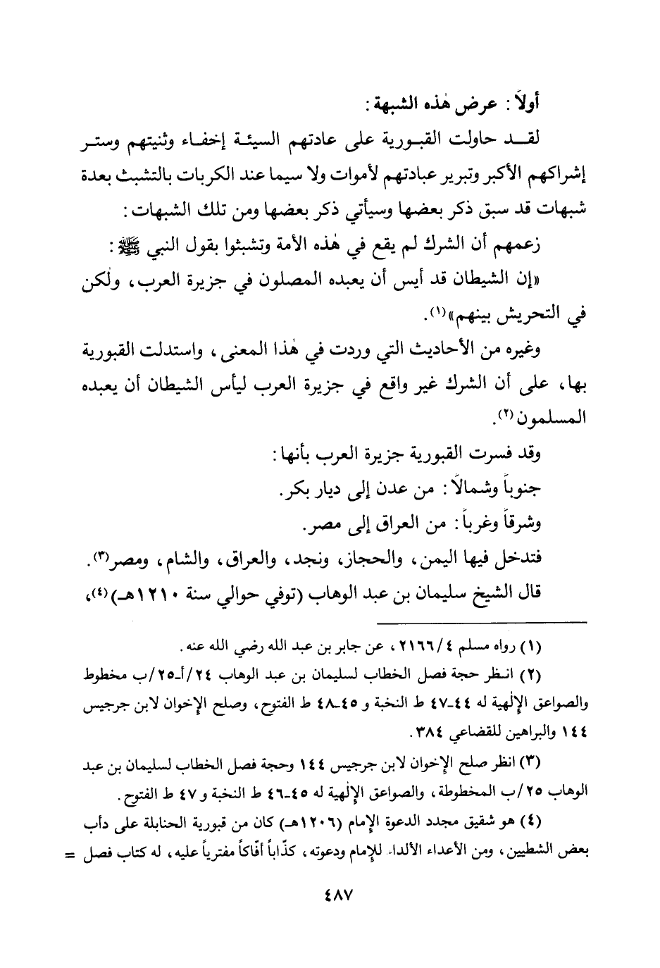 وغيره من الأحاديث التي وردت في هذا المعنى، واستدلت القبورية بها، على أن الشرك غير واقع في جزيرة العرب ليأس الشيطان أن يعبده المسلمون.