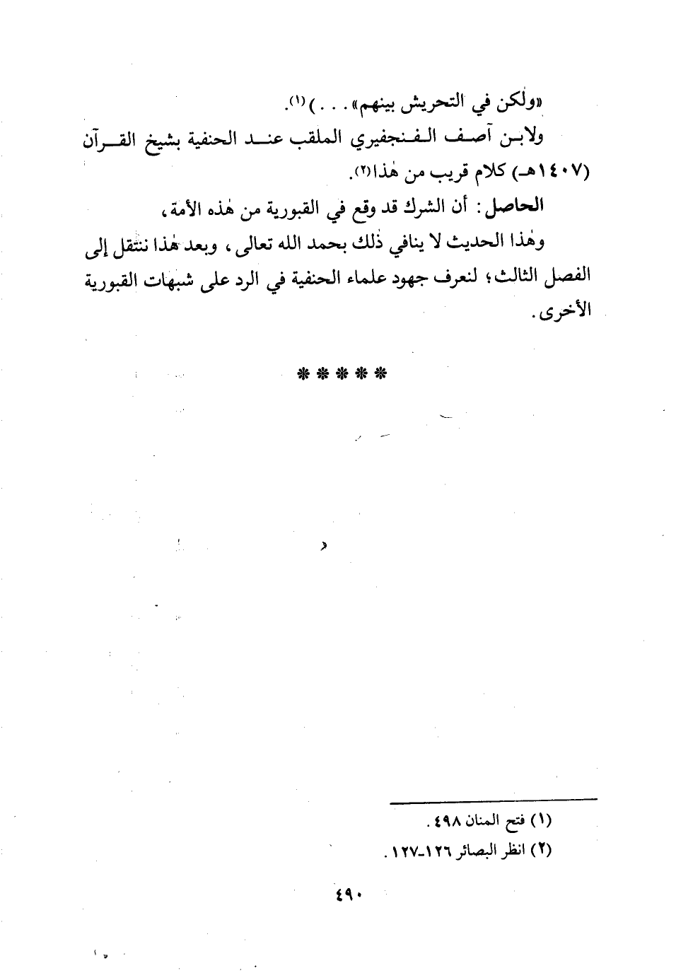 الحاصل: أن الشرك قد وقع في القبورية من هذه الأمة، وهذا الحديث لا ينافي ذلك بحمد الله تعالى، وبعد هذا ننتقل إلى الفصل الثالث؛ لنعرف جهود علماء الحنفية في الرد على شبهات القبورية الأخرى.