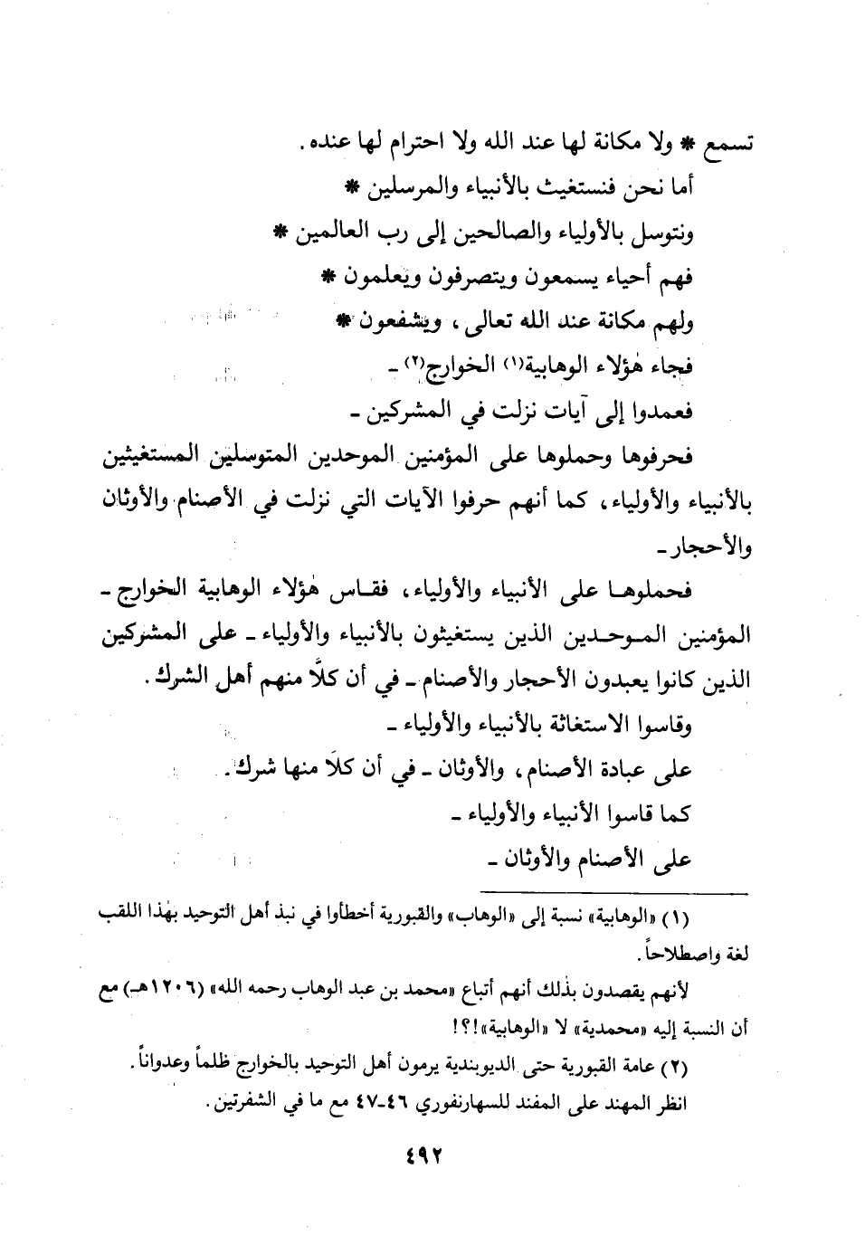 فجاء هؤلاء الوهابية الخوارج - فعمدوا إلى آيات نزلت في المشركين - فحرفوها وحملوها على المؤمنين الموحدين المتوسلين المستغيثين بالأنبياء والأولياء، كما أنهم حرفوا الآيات التي نزلت في الأصنام والأوثان والأحجار - فحملوها على الأنبياء والأولياء، فقاس هؤلاء الوهابية الخوارج - المؤمنين الموحدين الذين يستغيثون بالأنبياء والأولياء - على المشركين الذين كانوا يعبدون الأحجار والأصنام - في أن كلا منهم أهل الشرك.