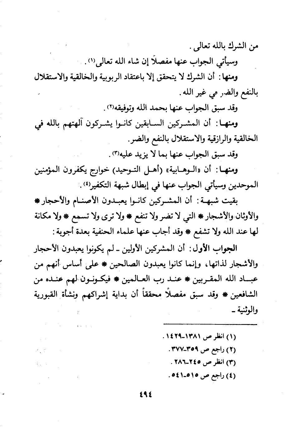 بقيت شبهة: أن المشركين كانوا يعبدون الأصنام والأحجار * والأوثان والأشجار * التي لا تضر ولا تنفع * ولا ترى ولا تسمع * ولا مكانة لها عند الله ولا تشفع * وقد أجاب عنها علماء الحنفية بعدة أجوبة: