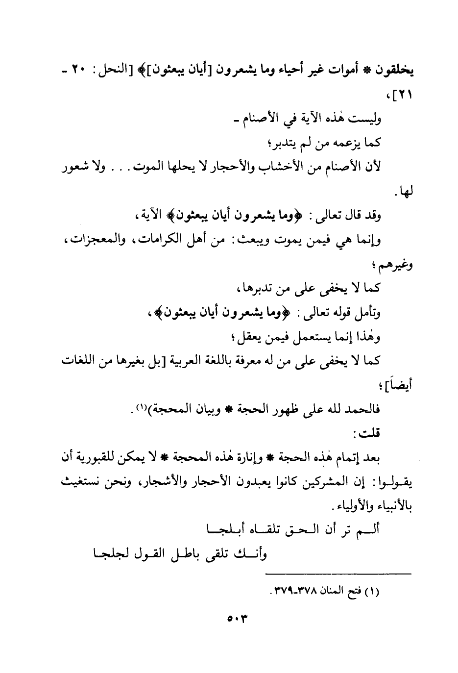 وقد قال تعالى: {وَمَا يَشْعُرُونَ أَيَّانَ يُبْعَثُونَ} الآية، وإنما هي فيمن يموت ويبعث: من أهل الكرامات، والمعجزات، وغيرهم؛ كما لا يخفى على من تدبرها، وتأمل قوله تعالى: {وَمَا يَشْعُرُونَ أَيَّانَ يُبْعَثُونَ} ، وهذا إنما يستعمل فيمن يعقل؛ كما لا يخفى على من له معرفة باللغة العربية [بل بغيرها من اللغات أيضا] ؛ فالحمد لله على ظهور الحجة * وبيان المحجة) .