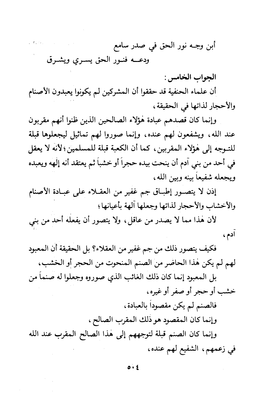 الجواب الخامس: أن علماء الحنفية قد حققوا أن المشركين لم يكونوا يعبدون الأصنام والأحجار لذاتها في الحقيقة، وإنما كان قصدهم عبادة هؤلاء الصالحين الذين ظنوا أنهم مقربون عند الله، ويشفعون لهم عنده، وإنما صوروا لهم تماثيل ليجعلوها قبلة للتوجه إلى هؤلاء المقربين، كما أن الكعبة قبلة للمسلمين؛ لأنه لا يعقل في أحد من بني آدم أن ينحت بيده حجرًا أو خشبًا ثم يعتقد أنه إلهه ويعبده ويجعله شفيعًا بينه وبين الله، إذن لا يتصور إطباق جم غفير من العقلاء على عبادة الأصنام والأخشاب والأحجار لذاتها وجعلها آلهة بأعيانها؛ لأن هذا مما لا يصدر من عاقل، ولا يتصور أن يفعله أحد من بني آدم، فكيف يتصور ذلك من جم غفير من العقلاء؟ بل الحقيقة أن المعبود لهم لم يكن هذا الحاضر من الصنم المنحوت من الحجر أو الخشب، بل المعبود إنما كان ذلك الغائب الذي صوروه وجعلوا له صنمًا من خشب أو حجر أو صفر أو غيره، فالصنم لم يكن مقصودًا بالعبادة، وإنما كان المقصود هو ذلك المقرب الصالح، وإنما كان الصنم قبلة لتوجههم إلى هذا الصالح المقرب عند الله في زعمهم، الشفيع لهم عنده،