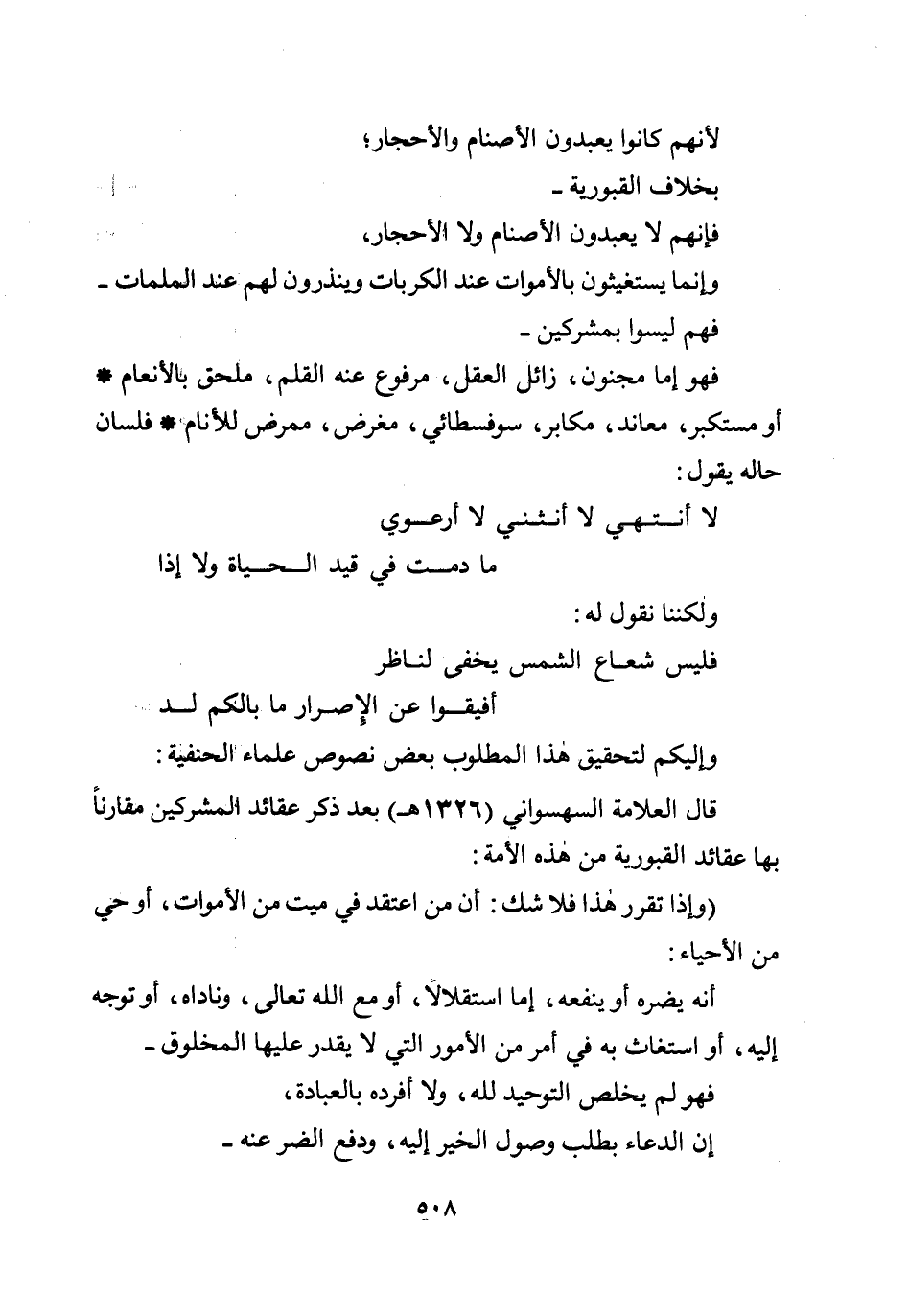 قال العلامة السهسواني (1326هـ) بعد ذكر عقائد المشركين مقارنًا بها عقائد القبورية من هذه الأمة: