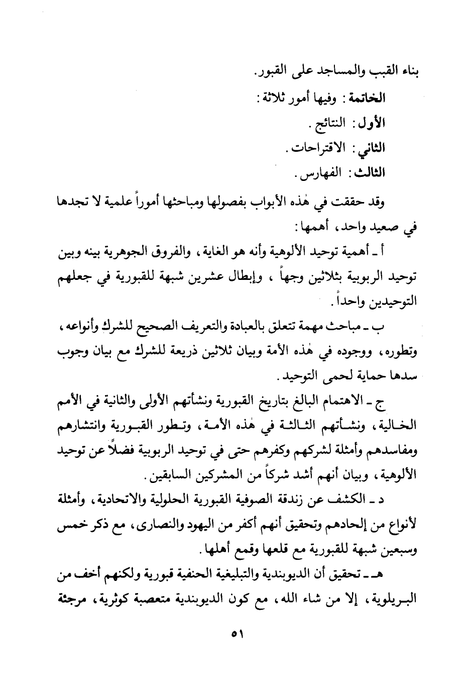د- الكشف عن زندقة الصوفية القبورية الحلولية والاتحادية، وأمثلة لأنواع من إلحادهم وتحقيق أنهم أكفر من اليهود والنصارى، مع ذكر خمس وسبعين شبهة للقبورية مع قلعها وقمع أهلها.