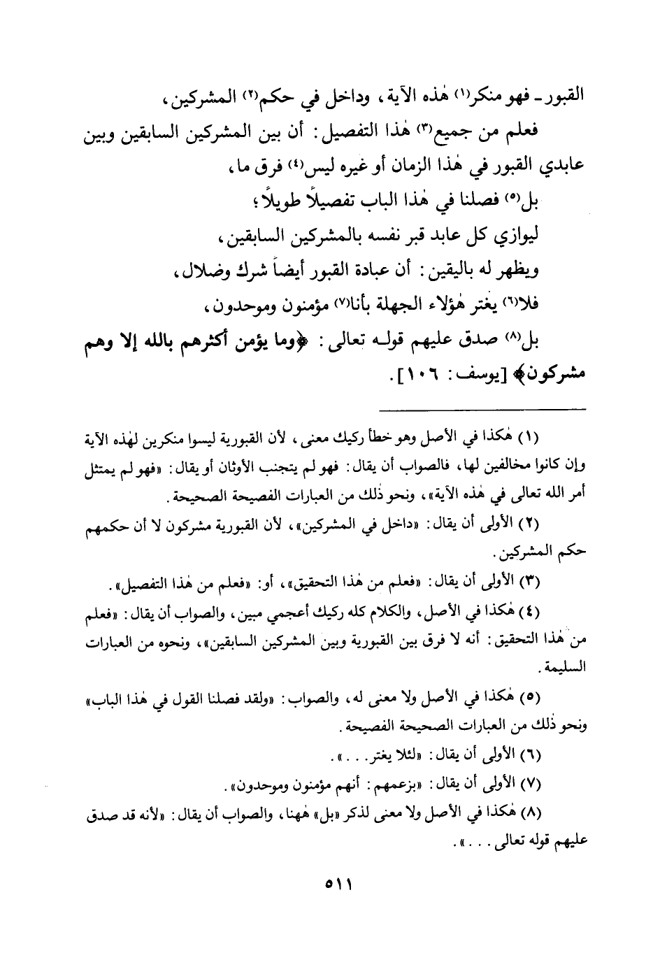 القبور - فهو منكر هذه الآية، وداخل في حكم المشركين؛ فعلم من جميع هذا التفصيل: أن بين المشركين السابقين وبين عابدي القبور في هذا الزمان أو غيره ليس فرق ما، بل فصلنا في هذا الباب تفصيلًا طويلًا؛ ليوازي كل عابد قبر نفسه بالمشركين السابقين، ويظهر له باليقين: أن عبادة القبور أيضًا شرك وضلال، فلا يغتر هؤلاء الجهلة بأنا مؤمنون وموحدون، بل صدق عليهم قوله تعالى: {وَمَا يُؤْمِنُ أَكْثَرُهُمْ بِاللَّهِ إِلَّا وَهُمْ مُشْرِكُونَ} [يوسف: 106] .