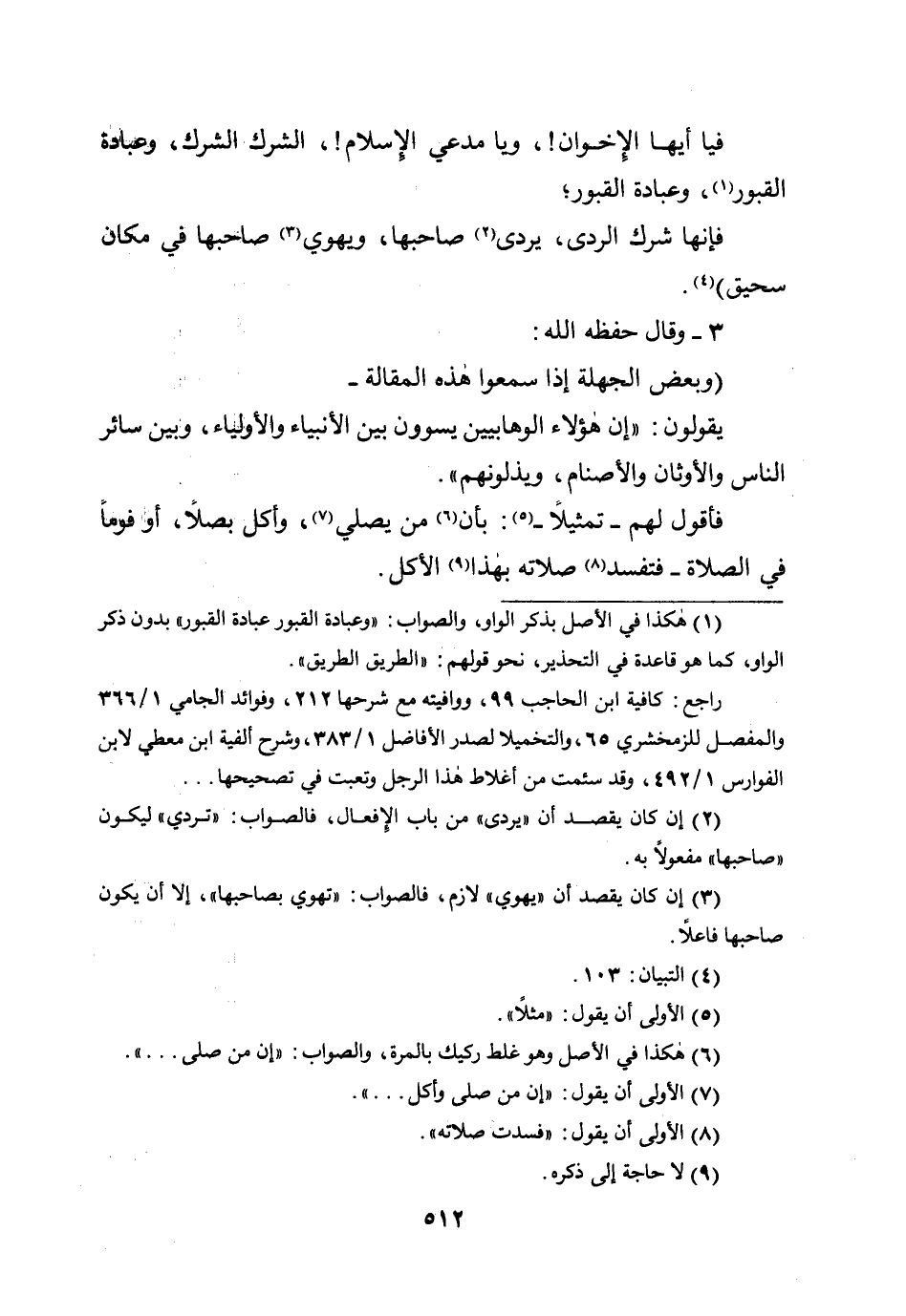 (وبعض الجهلة إذا سمعوا هذه المقالة - يقولون: ((إن هؤلاء الوهابيين يسوون بين الأنبياء والأولياء، وبين سائر الناس والأوثان والأصنام، ويذلونهم)) .
