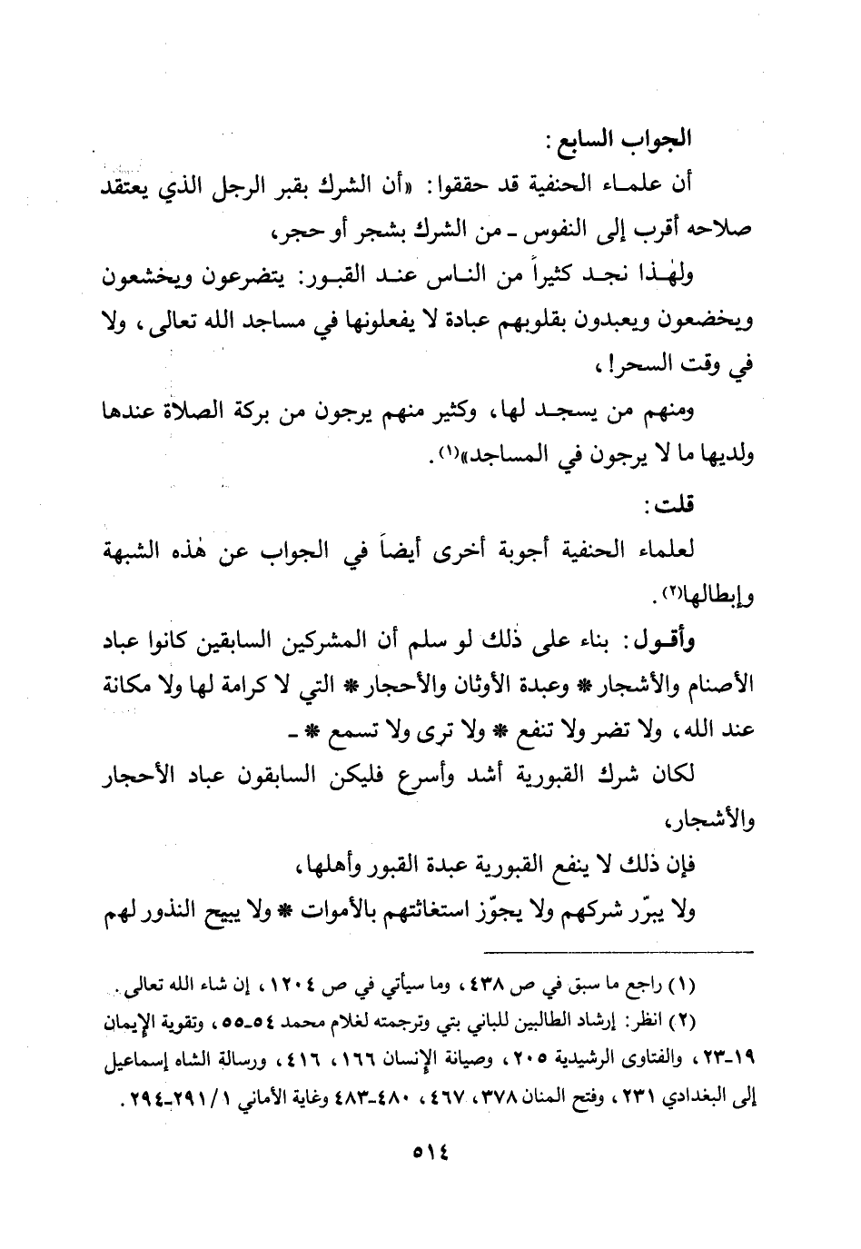وأقول: بناء على ذلك لو سلم أن المشركين السابقين كانوا عباد الأصنام والأشجار * وعبدة الأوثان والأحجار * التي لا كرامة لها ولا مكانة عند الله، ولا تضر ولا تنفع * ولا ترى ولا تسمع * - لكان شرك القبورية أشد وأسرع فليكن السابقون عباد الأحجار والأشجار، فإن ذلك لا ينفع القبورية عبدة القبور وأهلها، ولا يبرر شركهم ولا يجوز استغاثتهم بالأموات * ولا يبيح النذور لهم