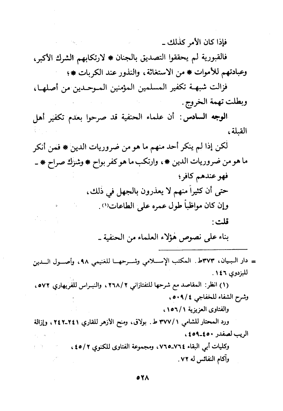 الوجه السادس: أن علماء الحنفية قد صرحوا بعدم تكفير أهل القبلة، لكن إذا لم ينكر أحد منهم ما هو من ضروريات الدين * فمن أنكر ما هو من ضروريات الدين *، وارتكب ما هو كفر بواح * وشرك صراح * - فهو عندهم كافر؛ حتى أن كثيرًا منهم لا يعذرون بالجهل في ذلك، وإن كان مواظبًا طول عمره على الطاعات.