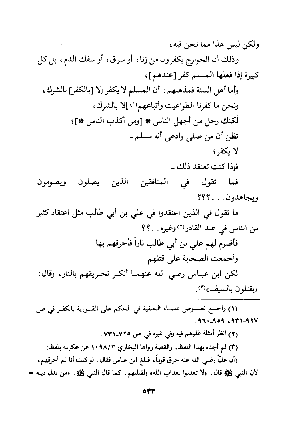 ولكن ليس هذا مما نحن فيه، وذلك أن الخوارج يكفرون من زنا، أو سرق، أو سفك الدم، بل كل كبيرة إذا فعلها المسلم كفر [عندهم] ، وأما أهل السنة فمذهبهم: أن المسلم لا يكفر إلا [بالكفر] بالشرك، ونحن ما كفرنا الطواغيت وأتباعهم إلا بالشرك، لكنك رجل من أجهل الناس * [ومن أكذب الناس *] ؛ تظن أن من صلى وادعى أنه مسلم - لا يكفر؛ فإذا كنت تعتقد ذلك - فما تقول في المنافقين الذين يصلون ويصومون ويجاهدون ... ؟؟؟